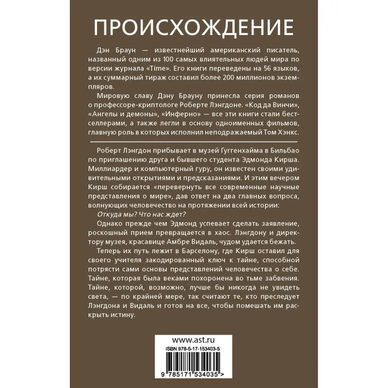 Пятая книга о расследовании профессора Роберта Лэнгдона от автора бестселлера Код Да Винчи Дэна Брауна. Четыре из пяти романов цикла уже экранизированы! Читайте книги и смотрите кино!