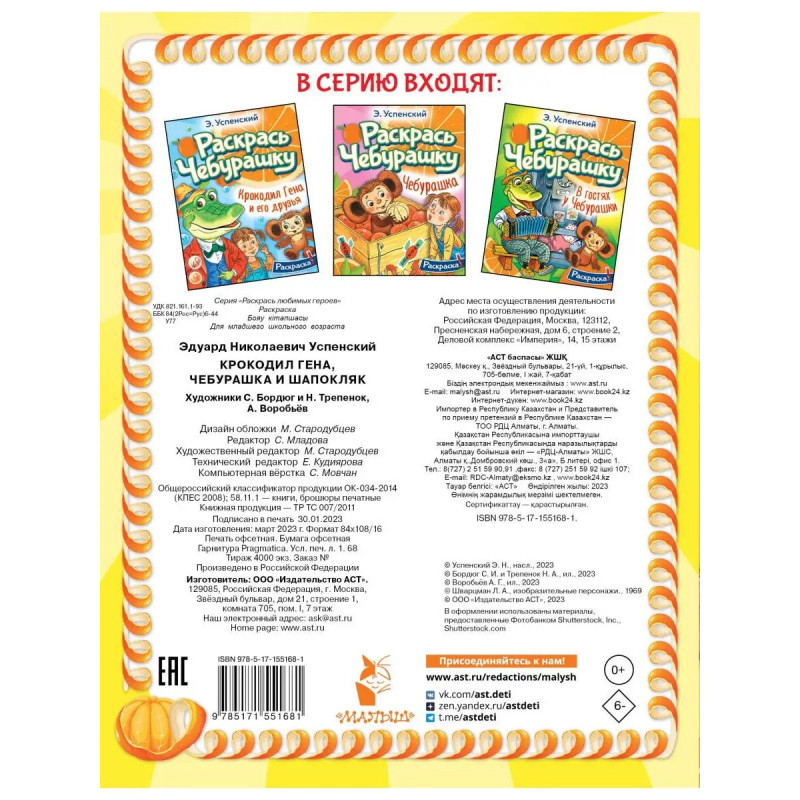 Крокодил Гена отслужил в армии и устроился на работу. Он охранял шоколад от грабителей. Но жулики во главе со старухой Шапокляк обманули Гену. Раскрась эту захватывающую детективную историю и узнаешь, как Чебурашка и Гена вернули себе честное имя. Раскрашивать Чебурашку и его друзей можно карандашами и фломастерами. Для младшего школьного возраста.