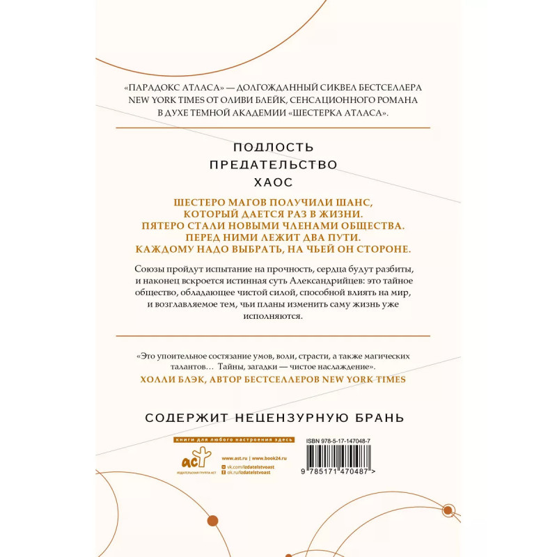 Парадокс Атласа. - Долгожданное продолжение самого ожидаемого в 222 году молодежного романа "Шестерка Атласа"! - Бестселлер New York Times! - Миллионы просмотров в TikTok по хештегу #theatlassix. - Шедевр жанра dark academy, напоминающий романы Ли Бардуго и сериал "Академия Амбрелла" одновременно. - Еще больше тайн, больше ножей в спину, больше хаоса! Шестерка магов получила уникальный шанс - получить доступ ко всем тайным знаниям мира. Пятерым из них, пусть и страшной ценой, это удалось. Но игра не закончена. Теперь каждому предстоит выбрать сторону. Союзы будут проверены на прочность, сердца разобьются на острые осколки, а Александрийское общество предстанет в своем истинном обличии необузданной, могучей силы. Силы, за которой стоит тот, чьим планам изменить ткань самой жизни - какой мы ее знаем - уже положено роковое начало. "Шестеро магов, столь же талантливых, сколь порочных, сойдутся в схватке, полной ошеломляющих предательств и многоходовок. Страсть, так похожая на магию: наполовину тайна, наполовину головоломка... И т