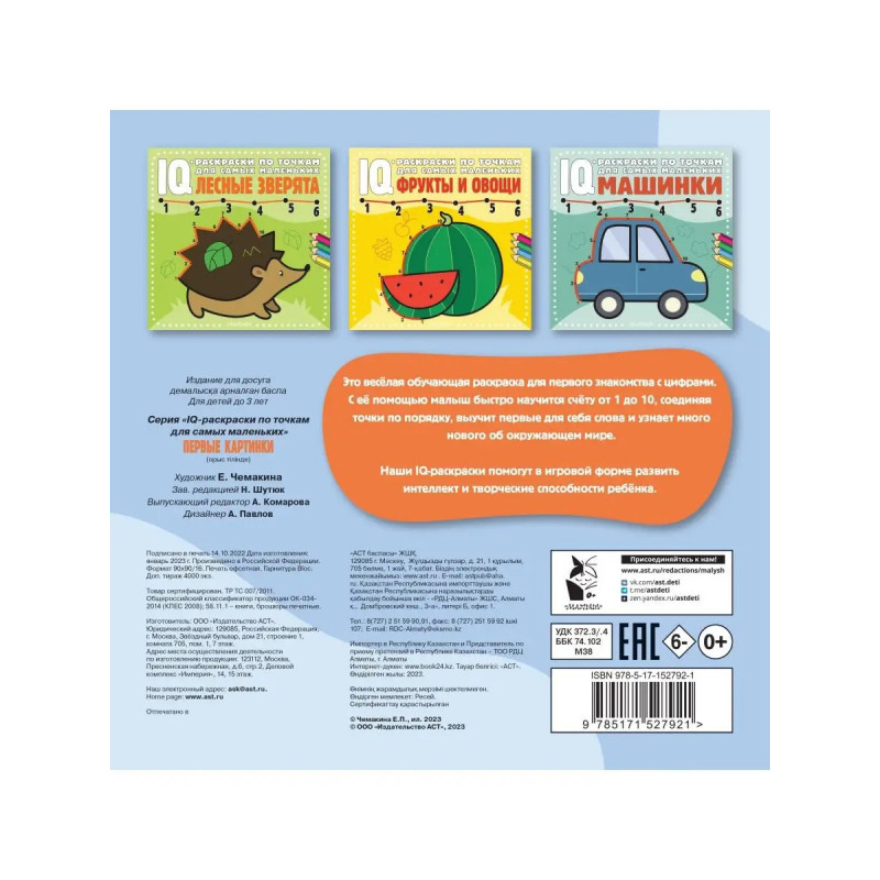 Это весёлая обучающая раскраска для первого знакомства с цифрами. С её помощью малыш быстро научится счёту от 1 до 1, соединяя точки по порядку, выучит первые для себя слова и узнает много нового об окружающем мире. Наши IQ-раскрски помогут в игровой форме развить интеллект и творческие способности ребёнка.