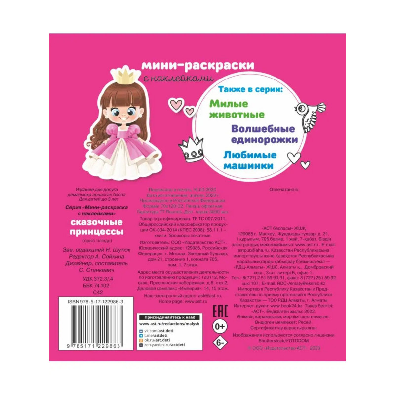 В этой раскраске тебя ждёт встреча с самыми настоящими принцессами, их друзьями и питомцами! Они знают все о придворной моде и королевских обязанностях, но в душе остаются самыми обычными девочками, которые с удовольствием расскажут тебе о себе. Скорее бери карандаши, фломастеры, краски - и вперед! А еще в этой раскраске - более 5 ярких наклеек, которыми можно украсить страницы раскраски.