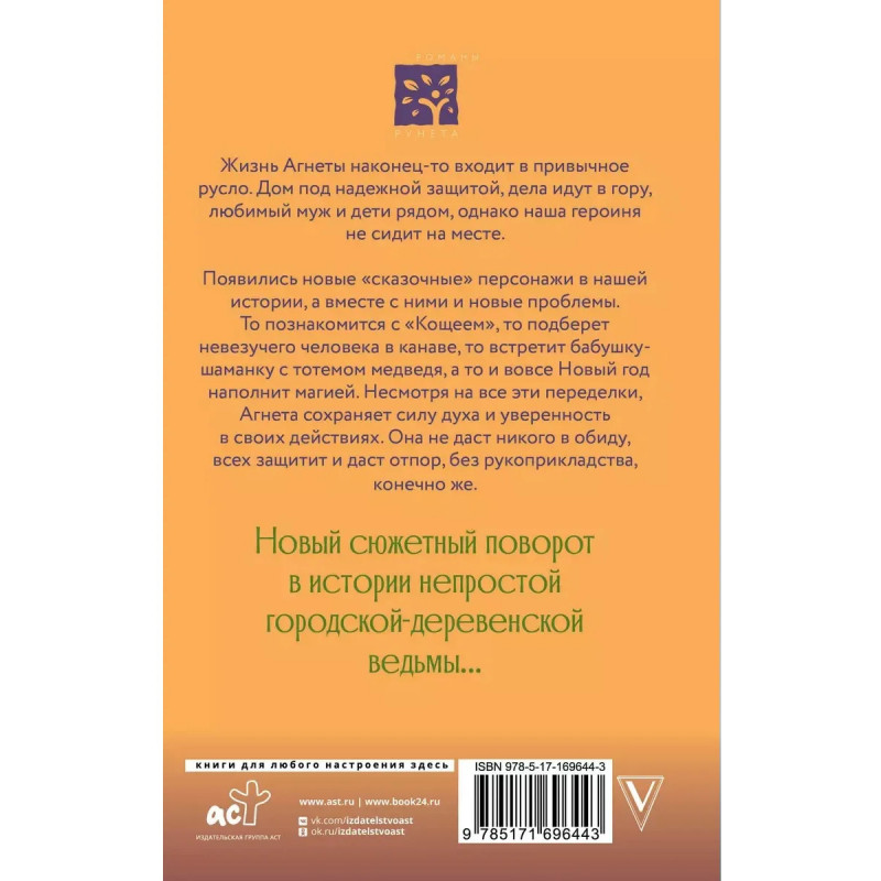 Жизнь Агнеты наконец-то входит в привычное русло. Дом под надежной защитой, дела идут в гору, любимый муж и дети рядом, однако наша героиня не сидит на месте. Появились новые "сказочные" персонажи в нашей истории, а вместе с ними и новые проблемы. То познакомится с "Кощеем", то подберет невезучего человека в канаве, то встретит бабушку- шаманку с тотемом медведя, а то и вовсе Новый год наполнит магией. Несмотря на все эти переделки, Агнета сохраняет силу духа и уверенность в своих действиях. Она не даст никого в обиду, всех защитит и даст отпор, без рукоприкладства, конечно же. Новый сюжетный поворот в истории непростой городской-деревенской ведьмы...