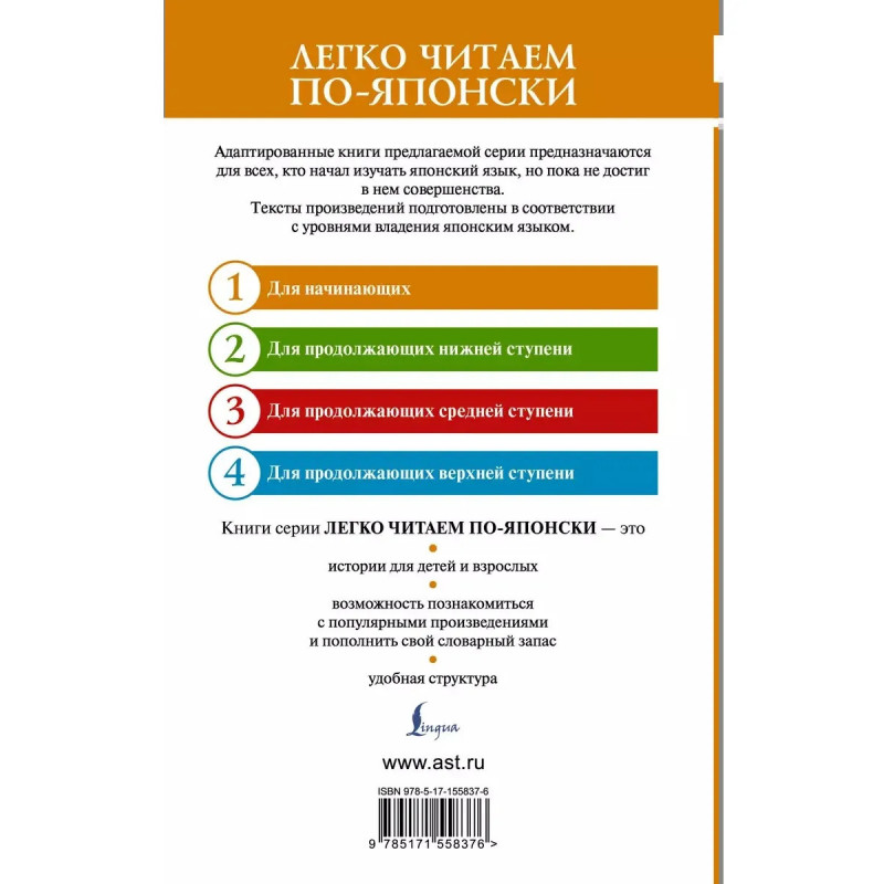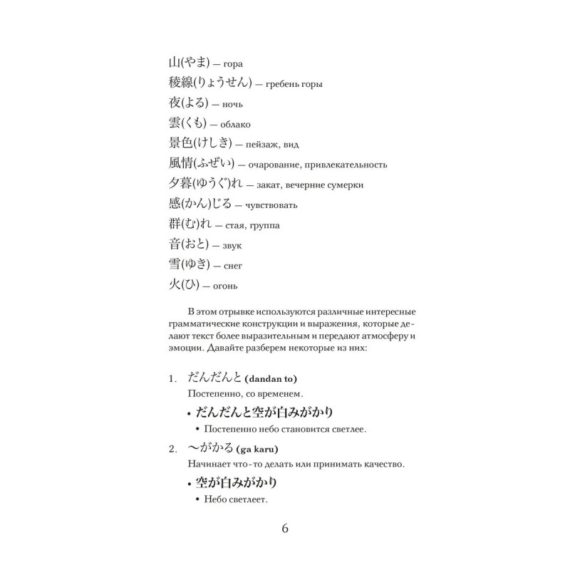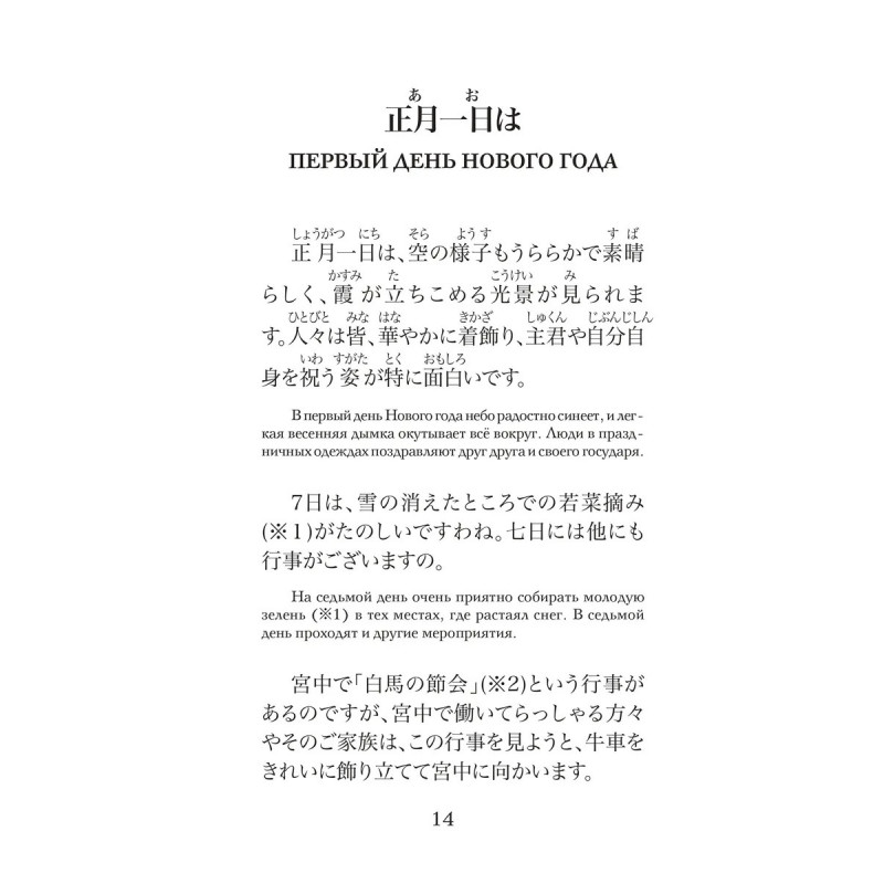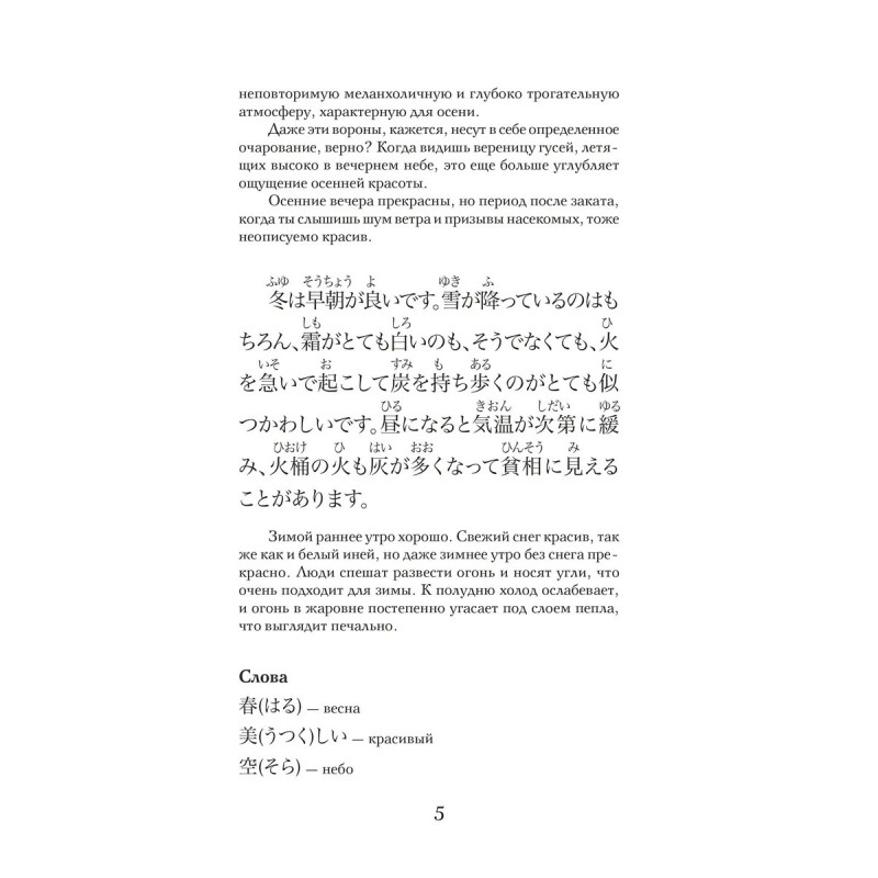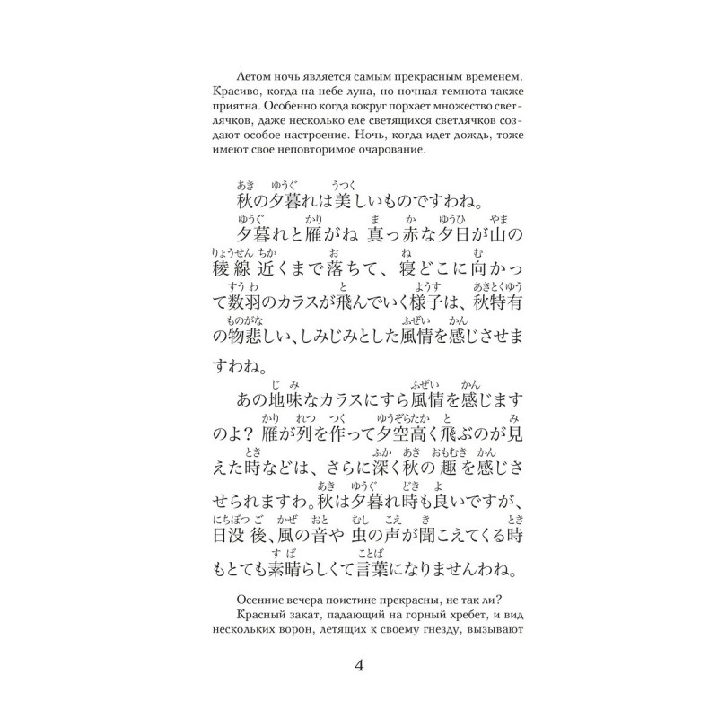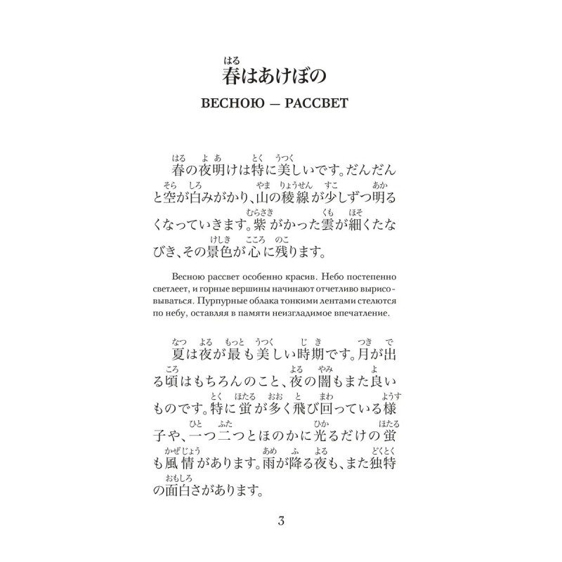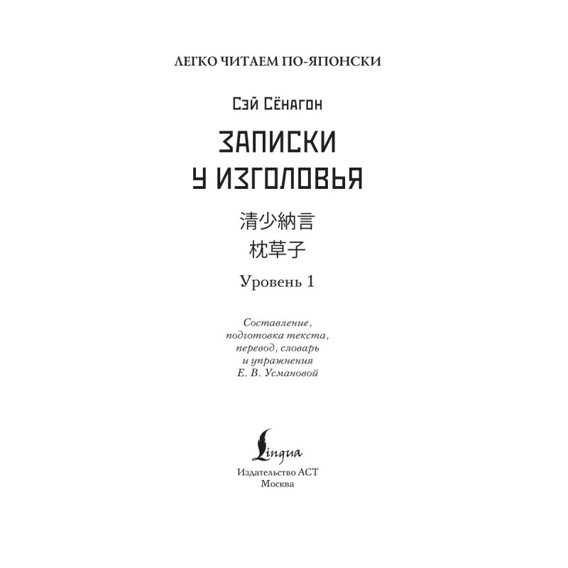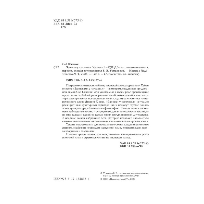 Погрузитесь в изысканный мир японской литературы эпохи Хэйан вместе с "Записками у изголовья" шедевром, созданным придворной дамой Сэй Сёнагон. Это уникальное в своём роде произведение представляет собой сборник размышлений, наблюдений и эссе, в которых раскрывается повседневная жизнь, культура и эстетика императорского двора Японии X века. "Записки у изголовья" не только расширят ваш культурный горизонт, но и помогут глубже понять японскую культуру, её ценности и философию. Каждая запись наполнена наблюдательностью и остроумием, давая возможность взглянуть на мир глазами одной из самых ярких фигур японской литературы. В издание вошли избранные эссе, которые позволят насладиться самыми значимыми и запоминающимися моментами произведения. Тексты подготовлены для начального уровня владения японским языком, снабжены переводом на русский язык, списками слов, комментариями и заданиями. Издание предназначено для всех, кто начал или продолжает учить японский язык и стремится читать на японском языке.