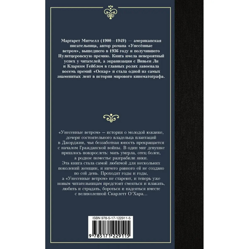 Маргарет Митчелл (19 1949) американская писательница, автор романа "Унесённые ветром", вышедшего в 1936 году и получившего Пулитцеровскую премию. Книга имела невероятный успех у читателей, а экранизация с Вивьен Ли и Кларком Гейблом в главных ролях завоевала восемь премий "Оскар" и стала одной из самых знаменитых лент в истории мирового кинематографа. "Унесенные ветром" история о молодой южанке, дочери состоятельного владельца плантаций в Джорджии, чья беззаботная юность прекращается с началом Гражданской войны. В один миг девушке пришлось повзрослеть: мать умерла, отец болен, а родное поместье разграбили янки. Эта книга стала самой любимой для нескольких поколений женщин, и ничего равного ей не создано по сей день. Проходят годы и годы, а "Унесенные ветром" не стареют, и теперь уже новым читательницам предстоит смеяться и плакать, любить и страдать, бороться и надеяться вместе с великолепной Скарлетт ОХара...