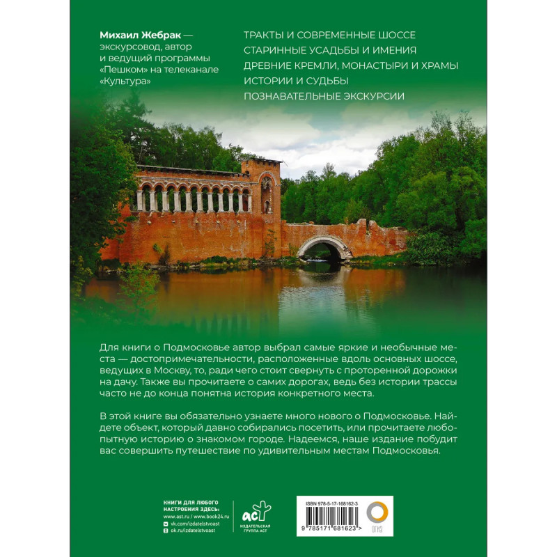 Автор книги, Михаил Жебрак, экскурсовод, автор и ведущий программы Пешком на телеканале Культура. Предлагаем вам вместе с Михаилом прогуляться по самым интересным местам Подмосковья. Для удобства книга разделена на разделы, каждый из которых посвящен основным шоссе, ведущим в Москву. Вы прочитаете о достопримечательностях и о самих дорогах, ведь без истории трассы часто не до конца понятна история конкретного места. Автор выбрал для описания самые яркие и необычные места, то, ради чего стоит свернуть с проторенной дорожки на дачу. Этот своеобразный прекрасно иллюстрированный авторский путеводитель отличный подарочный альбом для тех, кто, погружаясь в познавательный рассказ и выразительные фотографии, желает путешествовать не выходя из дома. В этом издании вы обязательно узнаете много нового о Подмосковье. Найдете объект, который давно собирались посетить или прочитаете любопытную историю о знакомом городе. Надеемся, эта книга побудит вас совершить путешествие по удивительным местам Подмосковья.