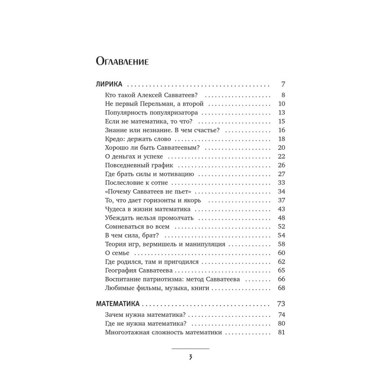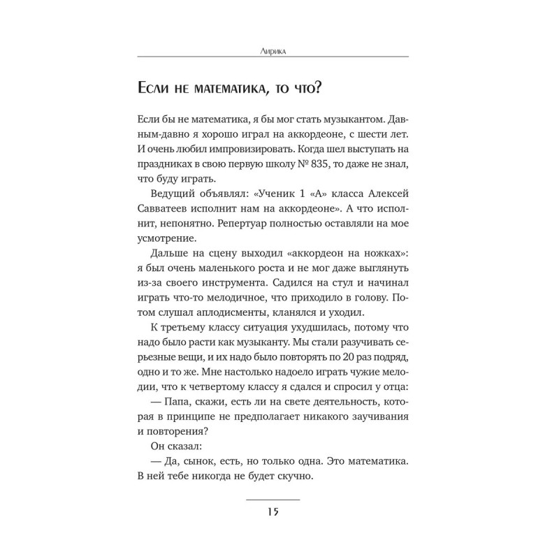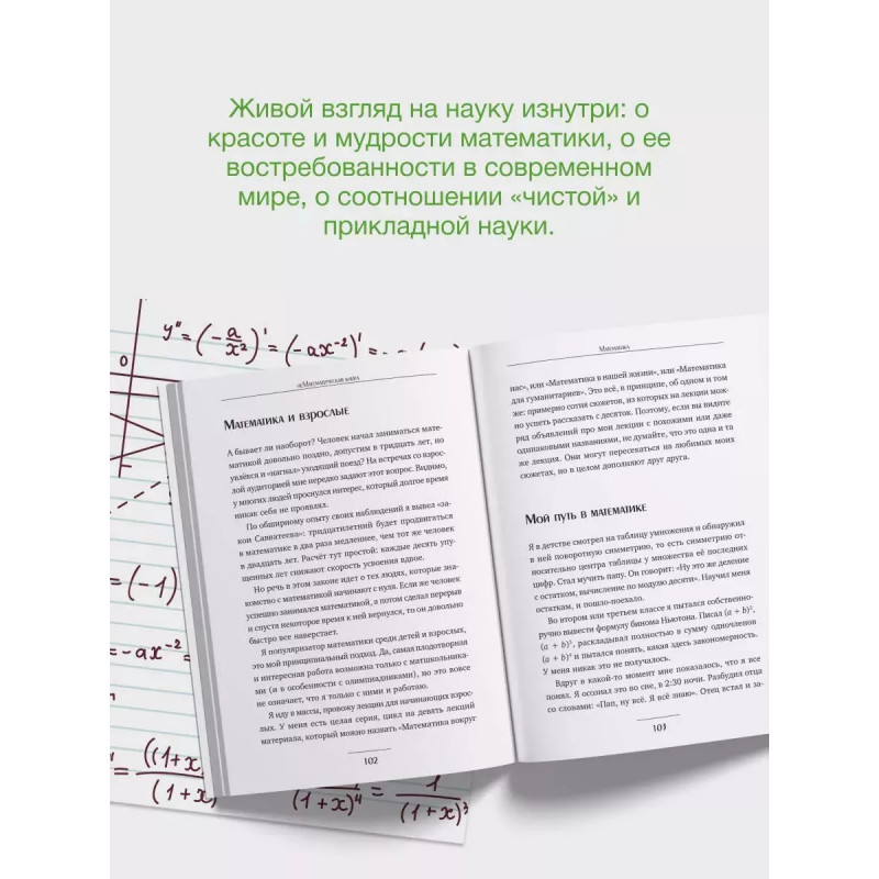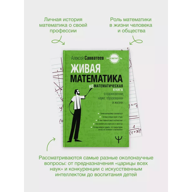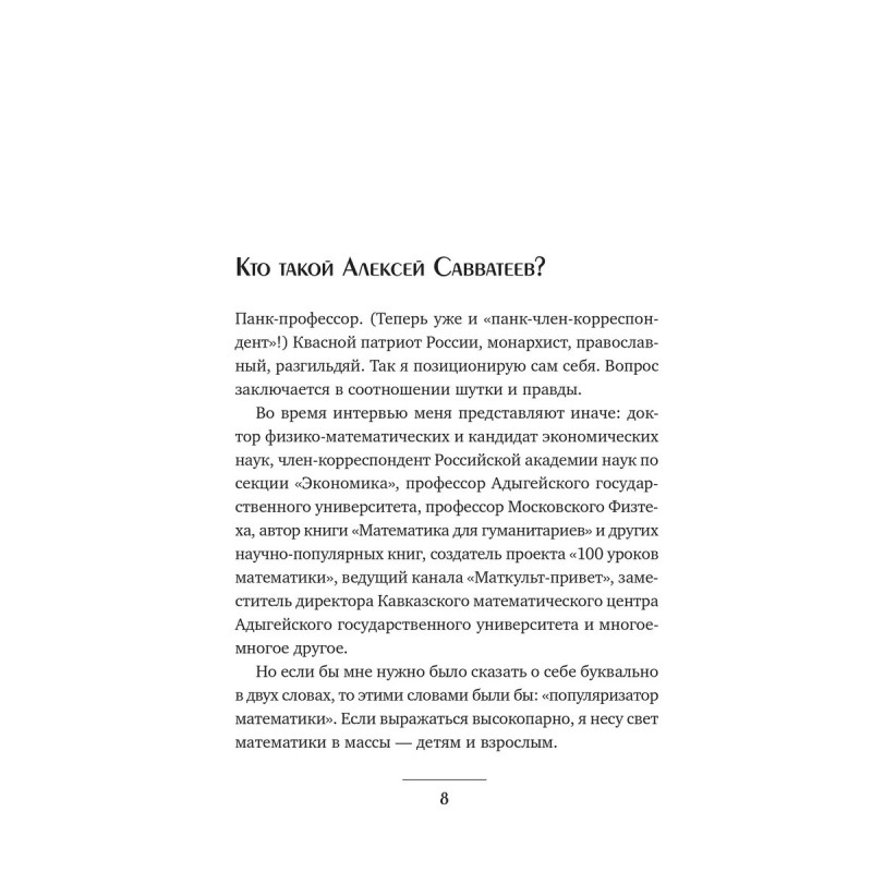 Математика не просто наука, а любовь! Вместе с известным популяризатором науки А. Савватеевым мы заглянем за кулисы науки и познакомимся с математикой поближе. Перед вами самая нематематическая книга о математике, и она влюбит вас в эту науку. Вы откроете для себя новый источник понимания жизни. Вы узнаете, какова роль математики в жизни современных людей и почему нужно продолжать учиться даже в зрелом возрасте. Автор книги Алексей Савватеев харизматичный профессор и популяризатор математики, лауреат премии Просветитель, тонко и остроумно размышляет о жизни, образовании и математике. Эта книга интеллектуальная отдушина для технарей и гуманитариев, переносит нас в уютную домашнюю обстановку, где обсуждаются самые разные околонаучные вопросы: почему математика необходима в эпоху информационных технологий? В чем красота математической науки? Объясняет ли математика жизнь?