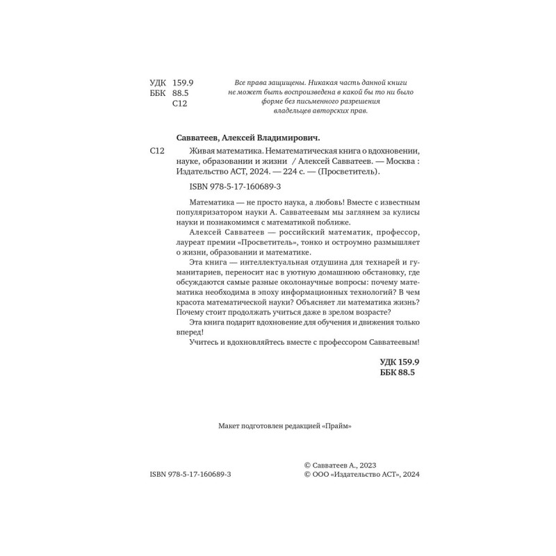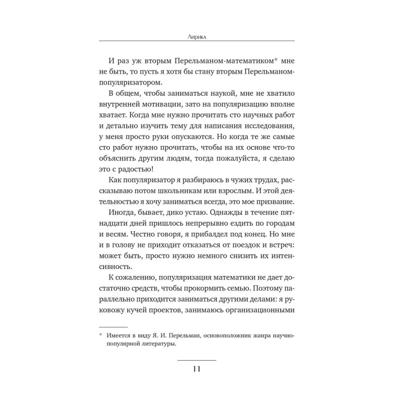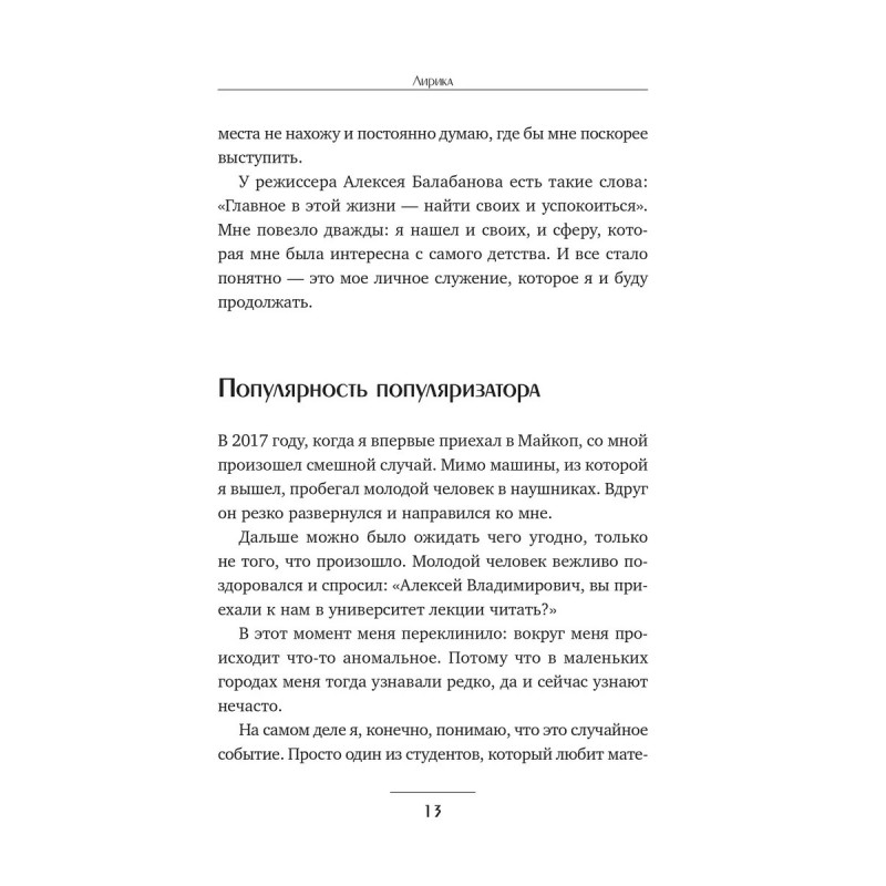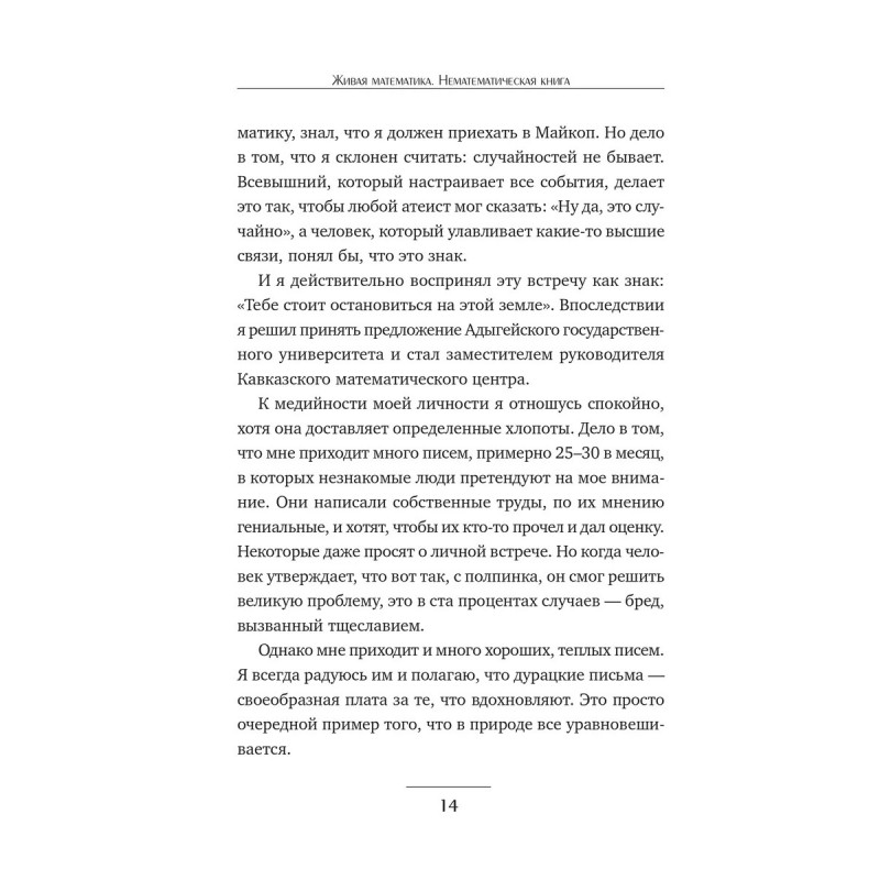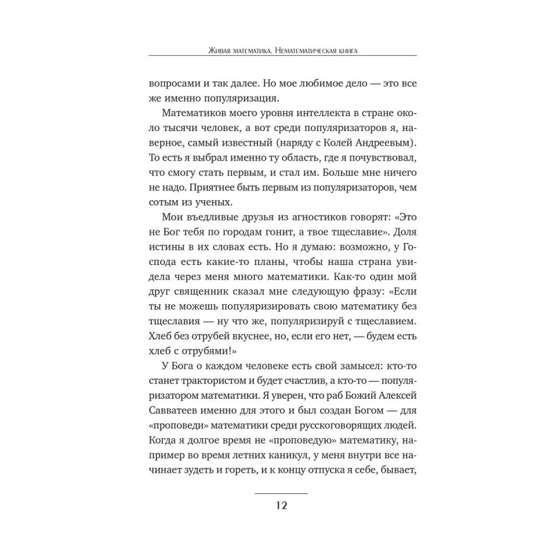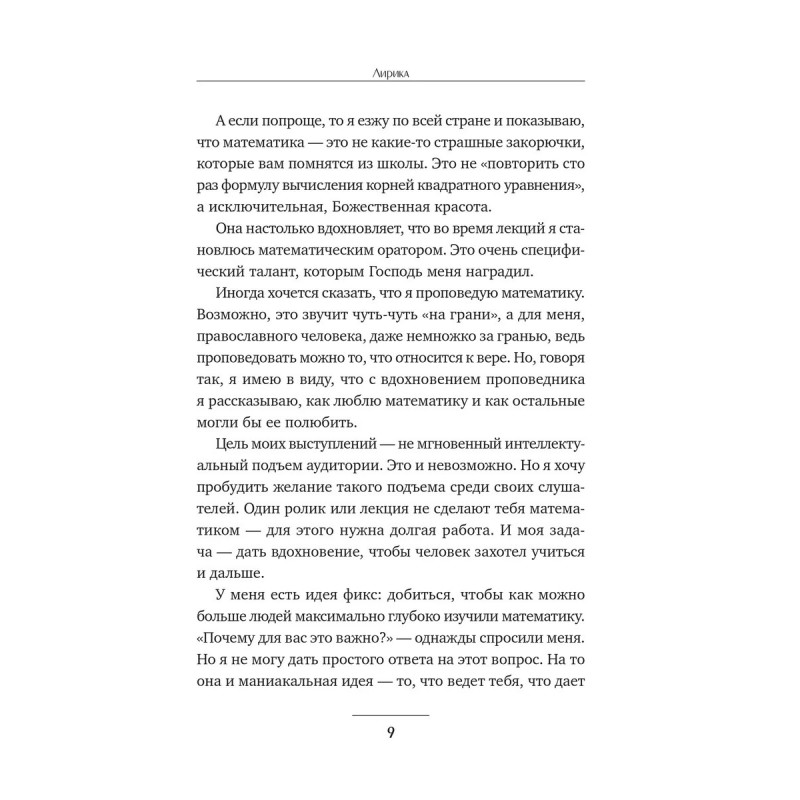 Математика не просто наука, а любовь! Вместе с известным популяризатором науки А. Савватеевым мы заглянем за кулисы науки и познакомимся с математикой поближе. Перед вами самая нематематическая книга о математике, и она влюбит вас в эту науку. Вы откроете для себя новый источник понимания жизни. Вы узнаете, какова роль математики в жизни современных людей и почему нужно продолжать учиться даже в зрелом возрасте. Автор книги Алексей Савватеев харизматичный профессор и популяризатор математики, лауреат премии Просветитель, тонко и остроумно размышляет о жизни, образовании и математике. Эта книга интеллектуальная отдушина для технарей и гуманитариев, переносит нас в уютную домашнюю обстановку, где обсуждаются самые разные околонаучные вопросы: почему математика необходима в эпоху информационных технологий? В чем красота математической науки? Объясняет ли математика жизнь?