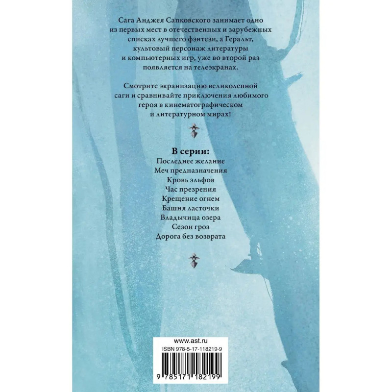 Сага Анджея Сапковского занимает одно из первых мест в отечественных и зарубежных списках лучшего фэнтези, а Геральт, культовый персонаж литературы и компьютерных игр, уже во второй раз появляется на телеэкранах. Таинственные силы Предназначения связали ведьмака Геральта с девочкой, принцессой по имени Цирилла. Возможно ли сбежать от своего Предназначения, ставшего судьбой и нужно ли это Геральту? Читайте продолжение великолепной саги и сравнивайте приключения любимого героя в кинематографическом и литературном мирах!