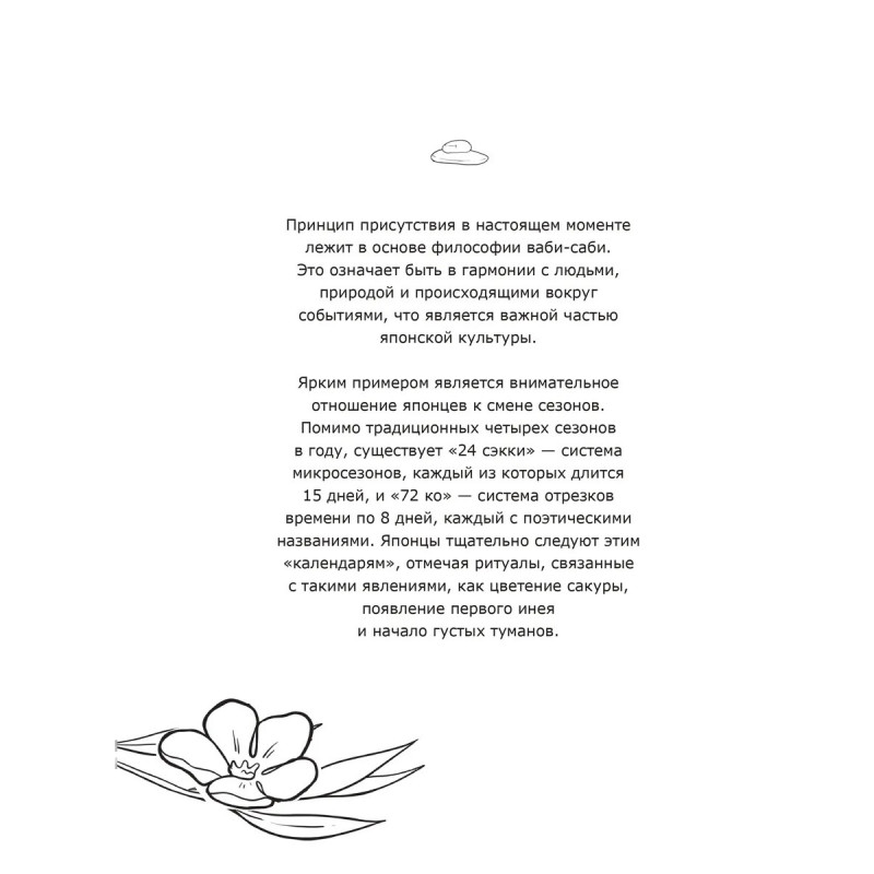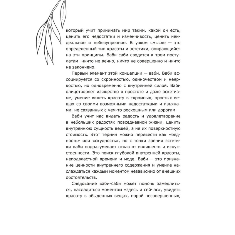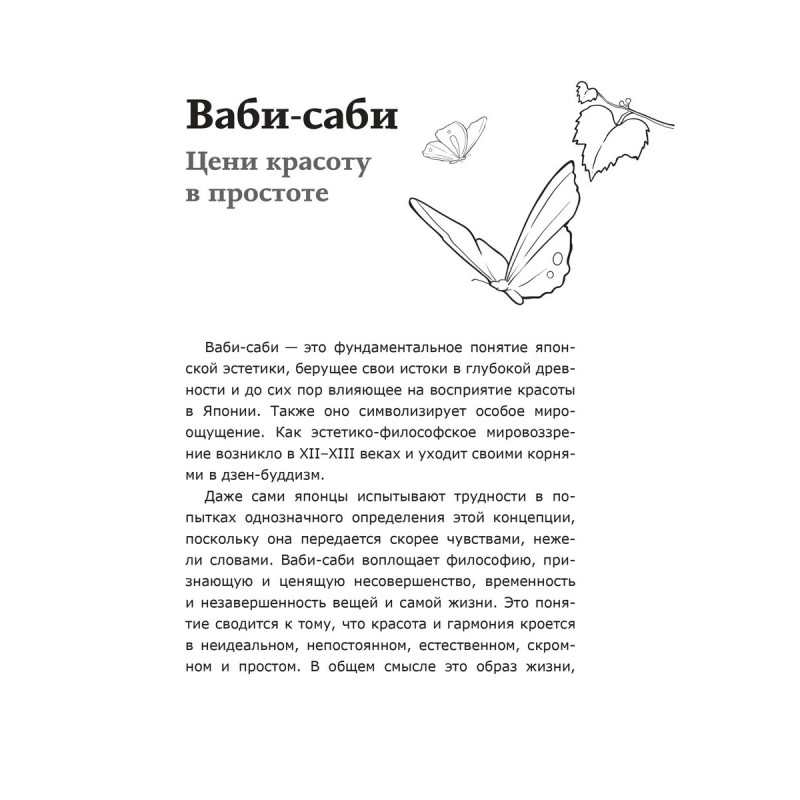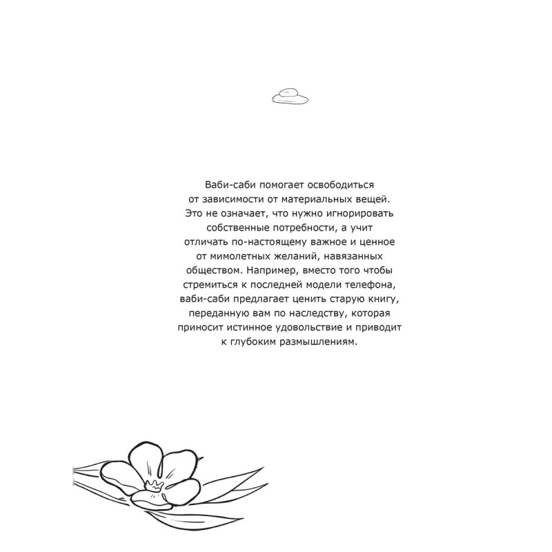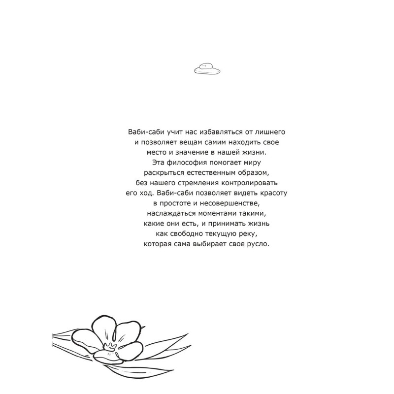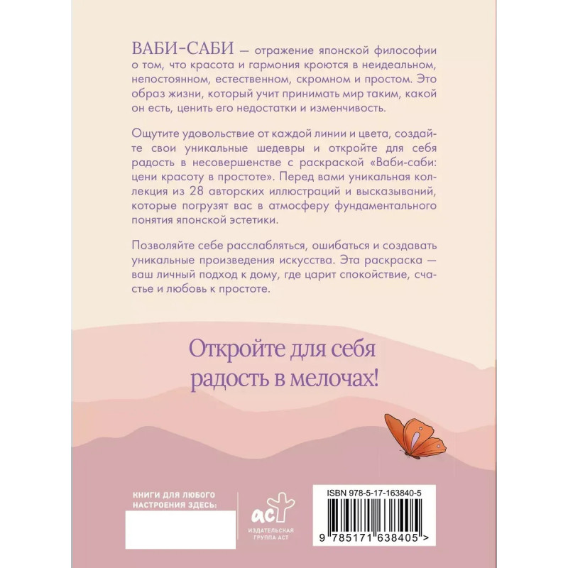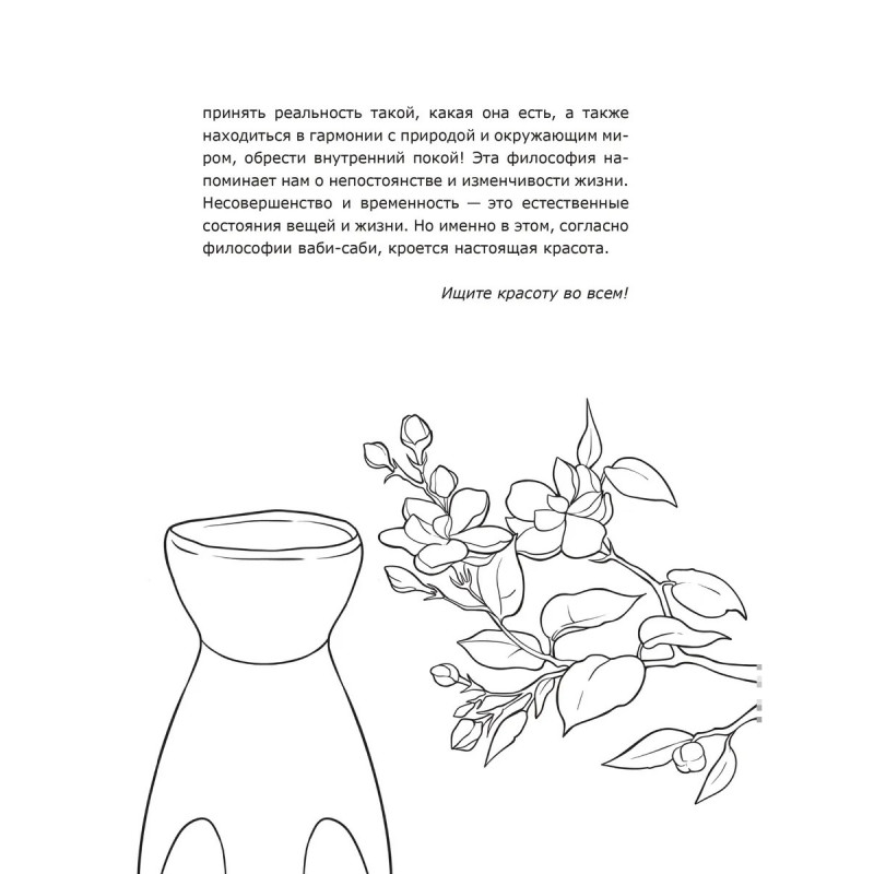 Ваби-саби отражение японской философии о том, что красота и гармония кроются в неидеальном, непостоянном, естественном, скромном и простом. Это образ жизни, который учит принимать мир таким, какой он есть, ценить его недостатки и изменчивость. Ощутите удовольствие от каждой линии и цвета, создайте свои уникальные шедевры и откройте для себя радость в несовершенстве с раскраской "Ваби-саби: цени красоту в простоте". Перед вами уникальная коллекция из 28 авторских иллюстраций и высказываний, которые погрузят вас в атмосферу фундаментального понятия японской эстетики. Позволяйте себе расслабляться, ошибаться и создавать уникальные произведения искусства. Эта раскраска ваш личный подход к дому, где царит спокойствие, счастье и любовь к простоте. Откройте для себя радость в мелочах!