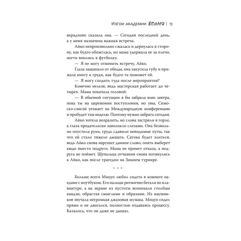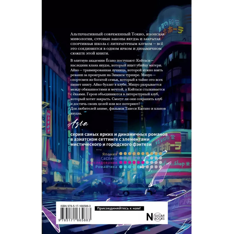 Альтернативный современный Токио, японская мифология, суровые законы якудза и закрытая спортивная школа с литературным клубом все это соединяется в одном ярком и динамичном сюжете этой книги. В элитную академию Ёсано поступают: Кэйтаси наследник клана якудза, который ищет убийцу матери. Айко травмированная лучница, которой нужно взять реванш за проигрыш на Зимнем турнире. Мицуо спортсмен из богатой семьи, который в тайне ото всех пишет книгу. Айко буллят в клубе, Мицуо разрывается между обязанностями и мечтой, а Кэйтаси сталкивается с ёкаями. Герои объединяются в литературный клуб, который хотят закрыть. Смогут ли они сохранить клуб и достичь своих целей или все потеряют? Для любителей аниме, фильмов Такеси Китано и кланов якудза.