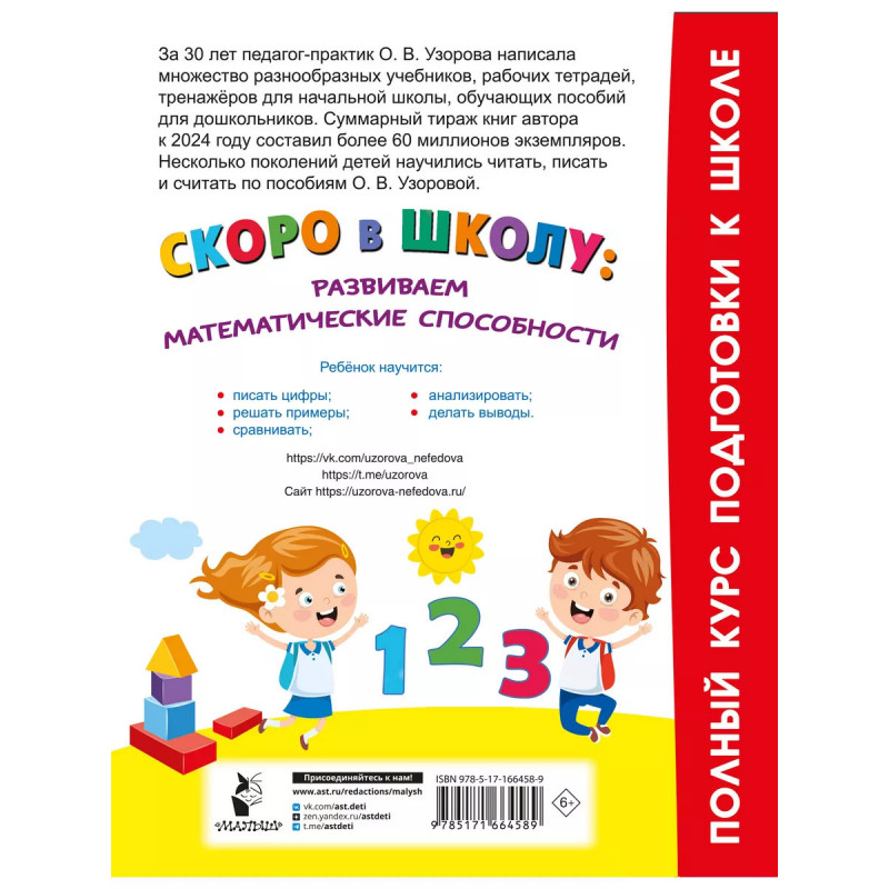 1 класс это не стресс, а ступенька в успешное будущее! Подготовить ребёнка к школе вам поможет Ольга Васильевна Узорова известный педагог-практик, автор более 6 000 книг для дошкольников и учеников младших классов. Суммарный тираж книг автора к 2024 году составил более 55 миллионов экземпляров. О. В. Узорова признана одним из наиболее востребованных в России авторов учебных пособий. Несколько поколений детей научились читать, писать и считать по пособиям О. В. Узоровой. Задания книги Скоро в школу: развиваем математические способности построены по принципу от простого к сложному. Занимайтесь всего 5-10 минут в день и ребёнок не только получит базовые знания, необходимые для успешного обучения в школе, но и разовьёт математические способности, логику, интеллект, пространственное мышление, а также научится находить нестандартные выходы из различных ситуаций. Готовьтесь к школе эффективно, легко и с удовольствием!