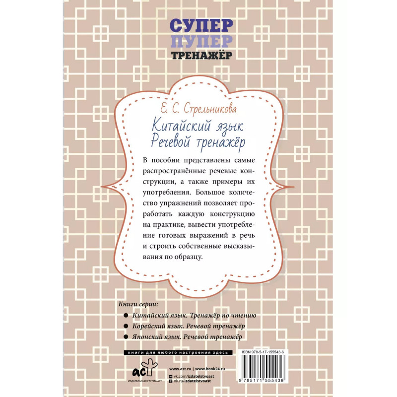 Стрельникова Елена Сергеевна выпускница РУДН, письменный и устный переводчик с китайского языка, преподаватель, автор учебных пособий. В данном пособии представлены самые распространенные китайские речевые конструкции, а также примеры их употребления в контексте. Большое количество упражнений позволяет проработать каждую конструкцию на практике и выработать устойчивые навыки использования в речи. Данное пособие подходит для всех, кто учит китайский язык.