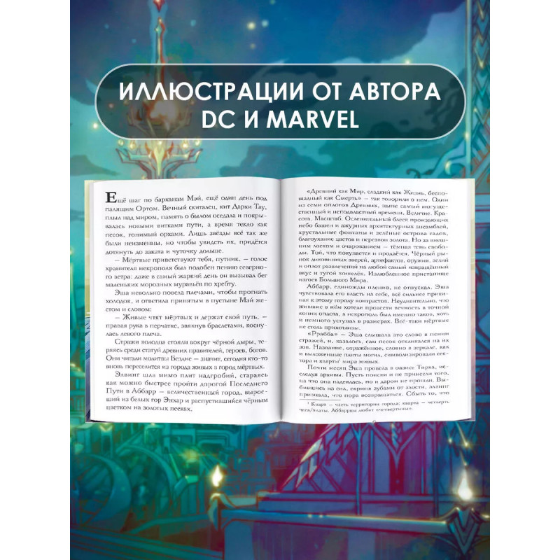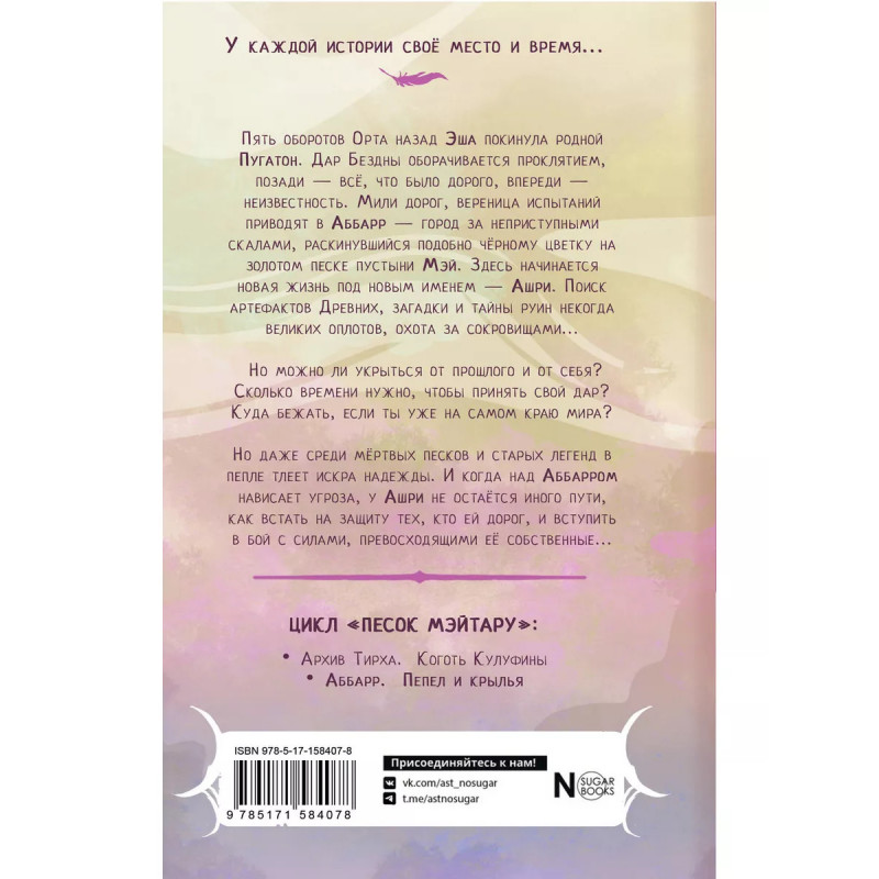Аббарр. Пепел и крылья. Продолжение гастрономическое роад-стори-фэнтези от художницы DC и Marvel! Пять оборотов Орта назад Эша покинула родной Пугатон. Дар Бездны оборачивается проклятием, позади - всё, что было дорого, впереди - неизвестность. Мили дорог, вереница испытаний приводят Эшу в Аббарр - город за неприступными скалами, раскинувшийся подобно чёрному цветку на золотом песке пустыни Мэй на материке Мэйтару. Здесь она начинает новую жизнь под новым именем - Ашри. Оставшись одна, отгородившись от мира, она занимается поиском артефактов и древних тайн в руинах некогда великих оплотов. Но можно ли укрыться от прошлого и от себя? Сколько времени нужно, чтобы принять свой дар? Куда бежать, если ты уже на самом краю мира? Но даже среди мёртвых песков и старых легенд в пепле тлеет искра надежды. И когда над Аббарром нависает новая угроза, у Ашри не остаётся иного пути, как встать на защиту тех, кто ей дорог и вступить в бой с силами, превосходящими её собственные... Вторая книга вселенной "Пески Мэйтару" Хельги Воджик, сотрудничавше