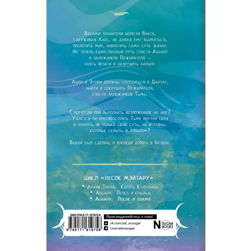 Продолжение приключенческой роад-стори-фэнтези от художницы DC и Marvel! Веками хранители берегли Врата, сдерживая Хаос, не давая ему вырваться, поглотить мир, извратить саму суть жизни. Но теперь единственный путь спасти Аббарр и заложников Пожирателя - снять печати и разрушить барьер. Ашри и Зурри должны спуститься в Дартау, найти и сокрушить Пожирателя, спасти заложников Тьмы. Смогут ли они выполнить возложенное на них? Удастся ли противостоять Тьме внутри себя и принять не только свою суть, но и тайны, которые скрыты в прошлом? Выбор был сделан и впереди дорога в Бездну. Третья книга вселенной "Пески Мэйтару" Хельги Воджик с иллюстрациями автора.
