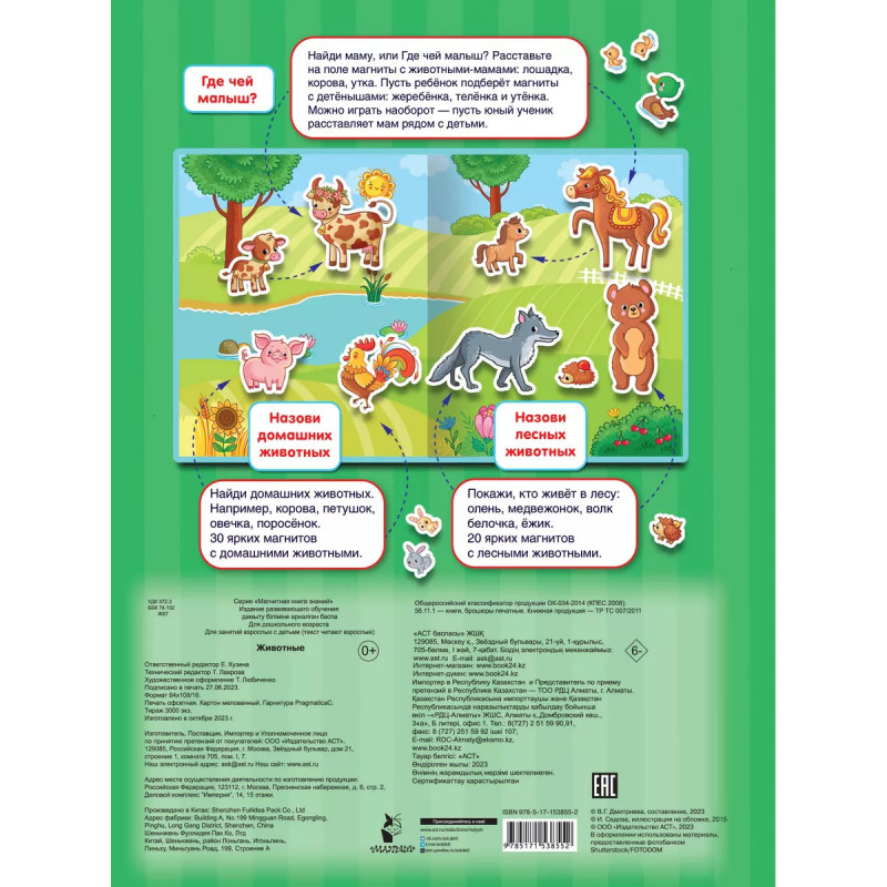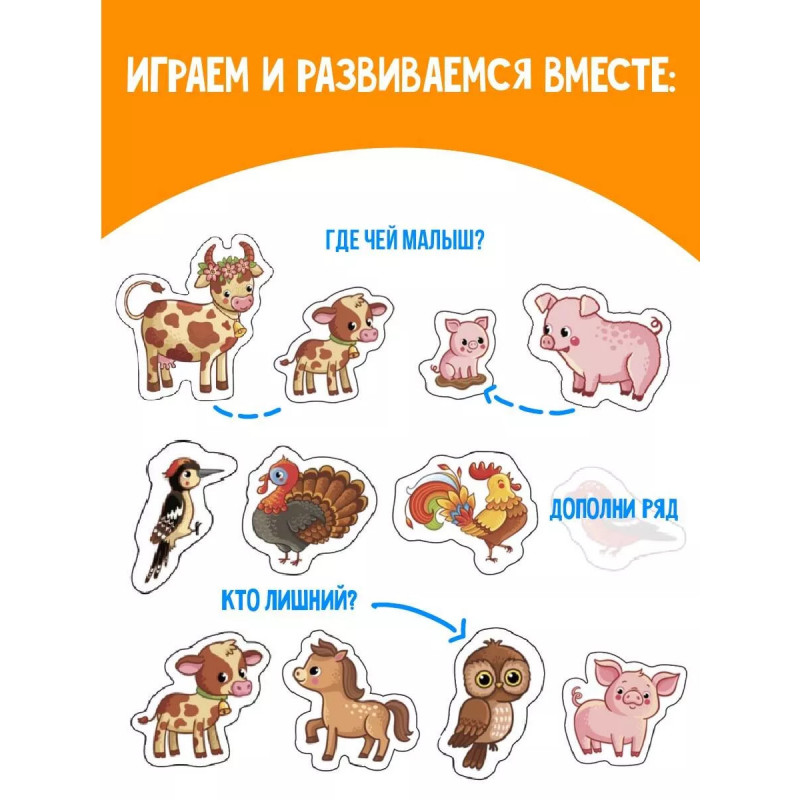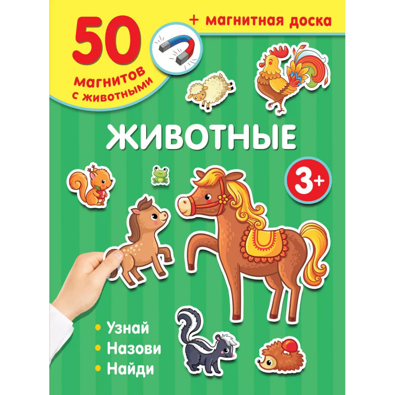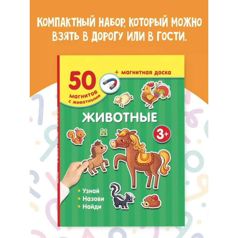 Животные. Ваш малыш любит животных? Или он, наоборот, ими не интересуется? И в том, и в другом случае на помощь родителям придёт магнитная книга "Животные". Ребёнок сам решит, куда прикрепить магнитики с различными животными: овечкой, коровой, лошадью, курочкой и многими другими! Это компактный игровой набор с красочными разворотами, который можно взять в дорогу или в гости. Плотные магниты сделаны качественно и не будут отклеиваться от страничек книги. А ещё их можно прикрепить на холодильник или магнитную доску. Занятия с магнитной книгой "Животные" помогут ребёнку развить память, внимание, логику и мелкую моторику.