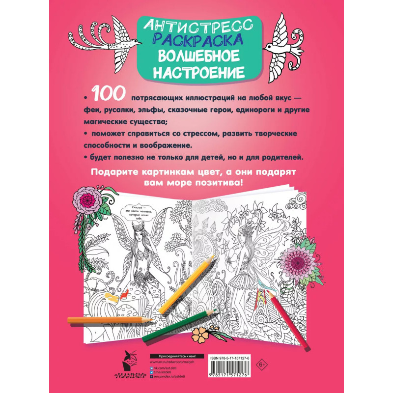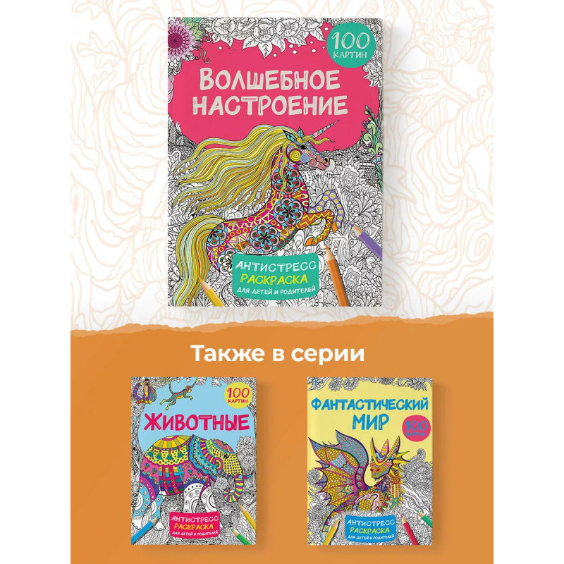 Волшебное настроение 100 картинок. Антистресс-раскраски - один из лучших способов победить стресс и расслабиться после трудного дня. Детям они помогают снизить уровень тревожности, выработать усидчивость и проявить творческие способности. "Волшебное настроение. 1 картинок" - замечательная антистресс-раскраска для поклонников волшебных сказок и фэнтези. На рисунках для расслабляющего отдыха - реальные и выдуманные существа, сказочные персонажи, волшебные узоры и орнаменты. Всего - более 1 картинок с обилием мелких деталей. Работа с мелкими объектами позволяет полностью погрузиться в процесс раскрашивания и отвлечься от дел. Раскраска отлично подойдёт как для детей, так и для их родителей.