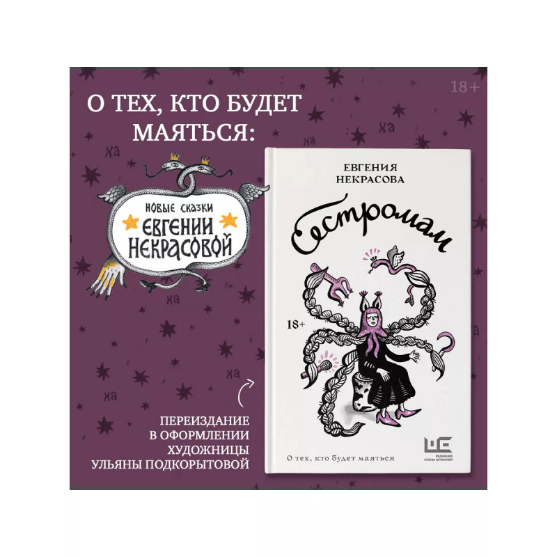 Сестромам. О тех, кто будет маяться. Евгения Некрасова - писательница, одна из основательниц Школы литературных практик, лауреатка премии "Лицей" за цикл прозы "Несчастливая Москва" и премии "Странник, НОС" за роман "Кожа". Её дебютный роман "Калечина-Малечина" и сборник рассказов "Сестромам" входили в короткие списки премии "НОС". Многие тексты Некрасовой поставлены в театрах, в том числе проза из сборника "Сестромам": спектакль по одноименному рассказу в студии "Дети райка" (реж. Юлия Скирина) и спектакль "В кольцах" по повести "Несчастливая Москва" в театре "Практика" (реж. Марина Брусникина). Книгу рассказов "Сестромам" населяют люди, животные и мифические существа. Четыре кольца охраняют Москву, да не всегда спасают; старуха превращается в молодую женщину, да не надолго. В повседневность здесь неизменно вмешивается магическое, а заговоры и сказы легко соседствуют с лондонскими диалектами. "Евгения Некрасова загораживается колдовскими узорами из слов и фантазий от безумия этого мира, от неуюта тесных квартир, от покинутых детей и стариков, от