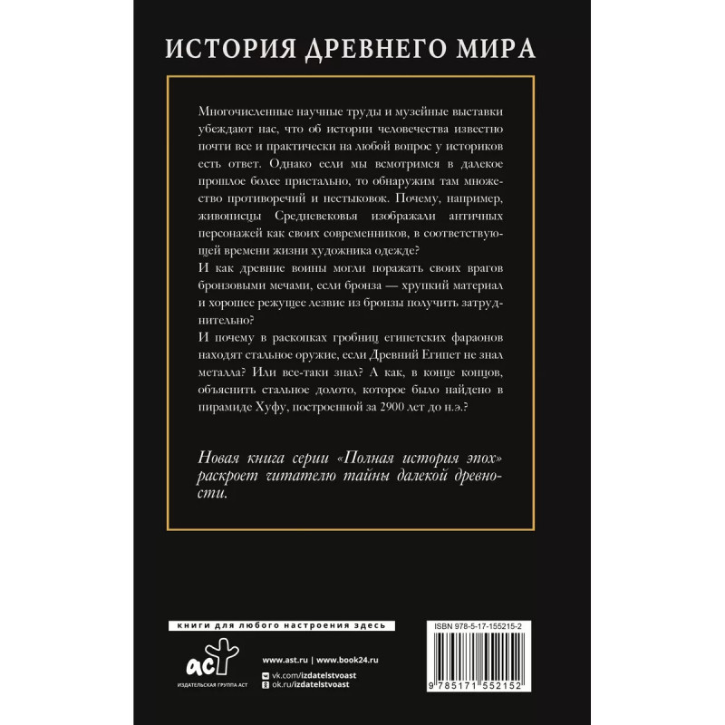 История Древнего мира. Многочисленные научные труды и музейные выставки убеждают нас, что об истории человечества известно почти все, и практически на любой вопрос у историков есть ответ. Однако если мы всмотримся в далекое прошлое более пристально, то обнаружим там множество противоречий и нестыковок. Почему, например, живописцы Средневековья изображали античных персонажей как своих современников в соответствующей времени жизни художника одежде? И как древние воины могли поражать своих врагов бронзовыми мечами, если бронза - хрупкий материал и хорошее режущее лезвие из бронзы получить затруднительно? И почему в раскопках гробниц египетских фараонов находят стальное оружие, если Древний Египет не знал металла? Или все-таки знал? А как, в конце концов, объяснить стальное долото, которое было найдено в пирамиде Хуфу, построенной за 29 лет до н.э.? Новая книга серии "Полная история эпох" раскроет читателю тайны далекой древности.
