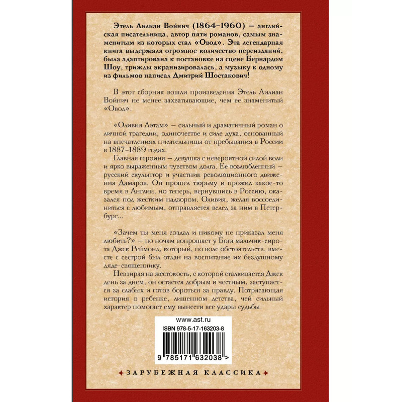 В этот сборник вошли произведения Этель Лилиан Войнич, не менее захватывающие чем ее знаменитый "Овод". "Оливия Лэтам" сильный и драматичный роман о личной трагедии, одиночестве и силе духа, основанный на впечатлениях писательницы от пребывания в России в 18871889 годах. Главная героиня девушка с невероятной силой воли и ярко выраженным чувством долга. Ее возлюбленный русский скульптор и участник революционного движения Дамаров. Он прошел тюрьму и прожил какое-то время в Англии, но теперь, вернувшись в Россию, оказался под жестким надзором. Оливия, желая воссоединиться с любимым, отправляется вслед за ним в Петербург "Зачем ты меня создал и никому не приказал меня любить?" по ночам вопрошает у Бога мальчик-сирота Джек Реймонд, который, по воле обстоятельств, вместе с сестрой был отдан на воспитание их бездушному дяде-священнику. Невзирая на жестокость, с которой сталкивается Джек день за днем, он остается добрым и честным, заступается за слабых и готов бороться за правду.