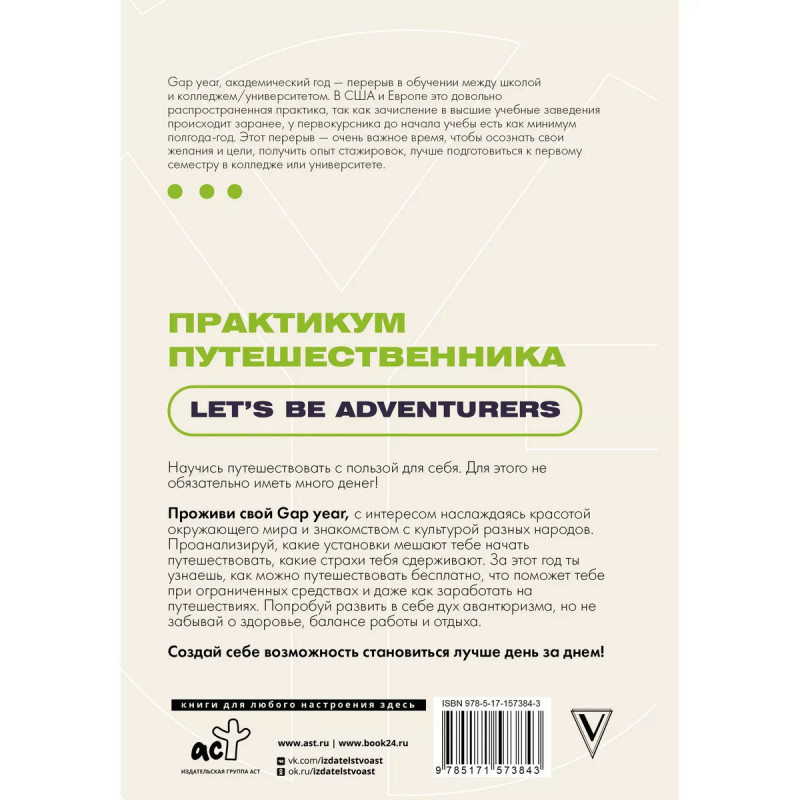 Практикум путешественника. Let's be adventurer. Gap year, академический год - перерыв в обучении между школой и колледжем, университетом. В США и Европе это довольно распространенная практика, так как зачисление в высшие учебные заведения происходит заранее, у первокурсника до начала учебы есть как минимум полгода-год. Этот перерыв - очень важное время, чтобы осознать свои желания и цели, получить опыт стажировок, лучше подготовиться к первому семестру в колледже или университете. Научись путешествовать с пользой для себя. Для этого не обязательно иметь много денег! Проживи свой Gap year, с интересом наслаждаясь красотой окружающего мира и знакомством с культурой разных народов. Проанализируй, какие установки мешают тебе начать путешествовать, какие страхи тебя сдерживают. За этот год ты узнаешь, как можно путешествовать бесплатно, что поможет тебе при ограниченных средствах и даже как заработать на путешествиях. Попробуй развить в себе дух авантюризма, но не забывай о здоровье, балансе работы и отдыха. Создай себе возможность становиться лучше день за днем