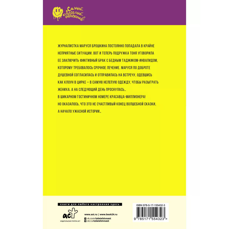 Чертик из консервной банки. Журналистка Маруся Брошкина постоянно попадала в крайне неприятные ситуации. Вот и теперь подружка Тоня уговорила ее заключить фиктивный брак с бедным таджиком-инвалидом, которому требовалось срочное лечение. Маруся по доброте душевной согласилась и отправилась на встречу, одевшись как клоун в цирке - в самую нелепую одежду, чтобы разыграть жениха. А на следующий день проснулась в шикарном гостиничном номере красавца-миллионера! Но оказалось, что это не счастливый конец волшебной сказки, а начало ужасной истории