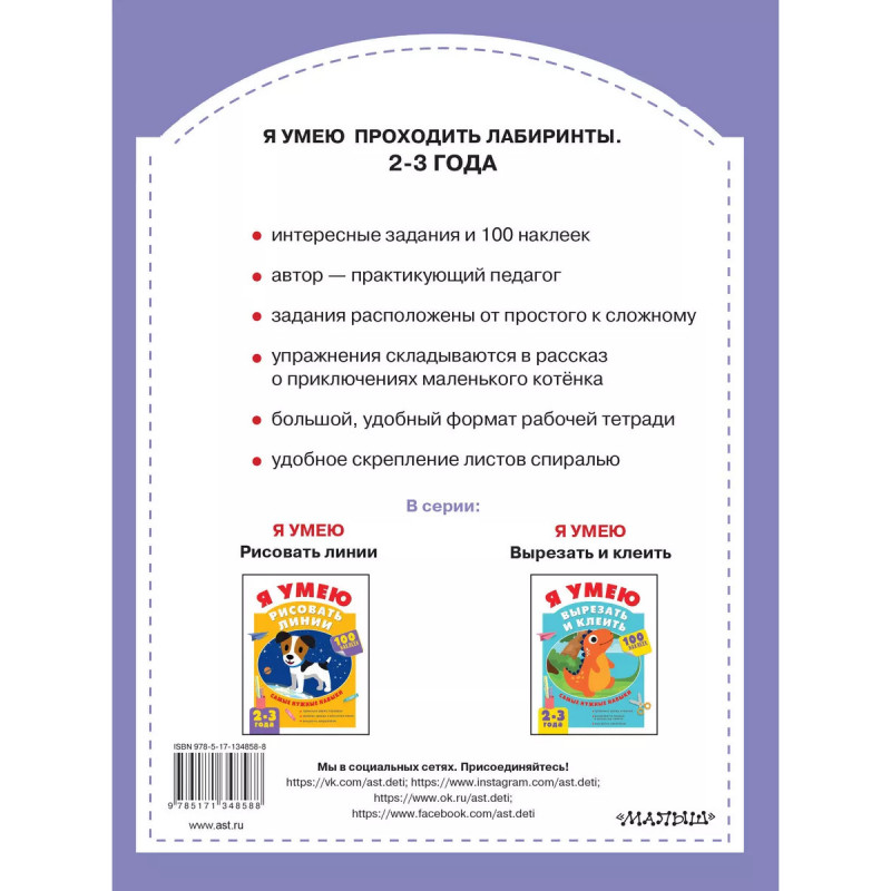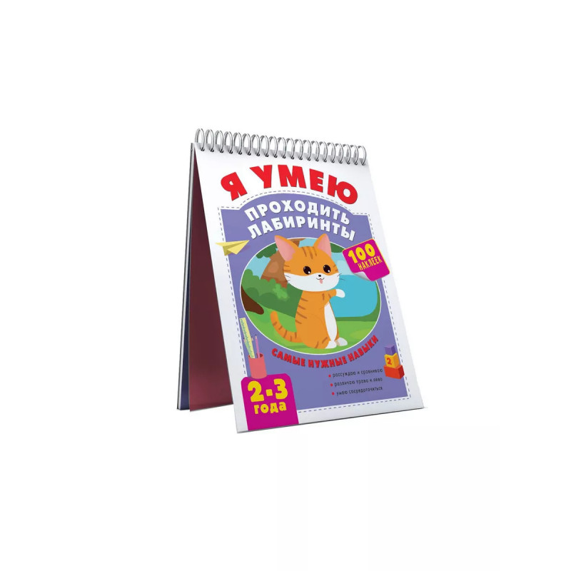 Я умею проходить лабиринты. 2-3 года. В тренажёре "Я умею проходить лабиринты. 2-3 года" собраны 48 интересных заданий, разработанных педагогами-практиками. Задания подобраны так, что ребёнок, пошагово, от простого к сложному, учится ориентироваться на листе бумаги, тренирует координацию "глаз-рука", логическое и пространственное мышление. Упражнения связаны единой темой - приключениями маленького котёнка. Благодаря интересным сюжетам и постепенному усложнению заданий, ребёнок, играя, освоит сложный навык и почувствует уверенность в своих силах. Тренажёр напечатан на специально подобранной плотной бумаге, с которой удобно работать. Переплёт на пружине, с одной стороны, не мешает выполнять задания, а с другой, позволяет аккуратно отделить от тетради нужные страницы. Для выполнения заданий в тренажёре есть наклейки, которые так нравятся малышам.