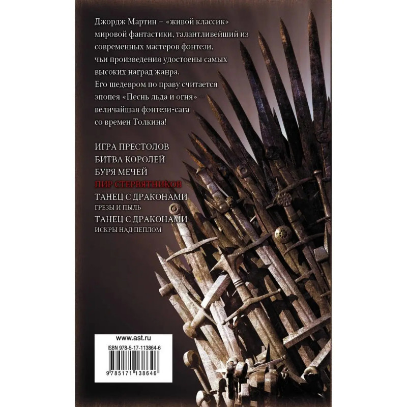 Перед вами четвертая летопись цикла "Песнь льда и огня". Эпическая, чеканная сага о мире Семи Королевств. О мире суровых земель вечного холода и радостных земель вечного лета. Мире лордов и героев, воинов и магов, чернокнижников и убийц всех, кого свела воедино Судьба во исполнение древнего пророчества. О мире опасных приключений, великих деяний и тончайших политических интриг. Война Пяти Королей наконец завершена, и дом Ланнистер с союзниками празднует победу. Однако до мира и спокойствия еще ОЧЕНЬ ДАЛЕКО! Властитель Севера Робб от дома Старк сумел подавить мятеж в далеких северных землях, однако его родичи, похоже, слишком слабы, чтобы удержать завоеванные земли Снова собираются воедино бандиты, ренегаты и уцелевшие повстанцы. Снова угрожает смертельная опасность Железному Трону Семи Королевств и стервятники уже чуют приближения НОВОГО ПИРА