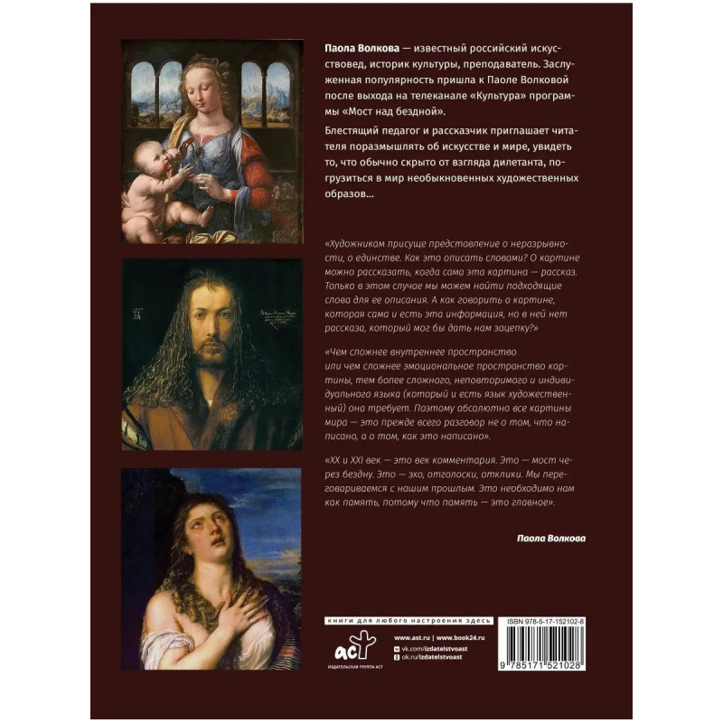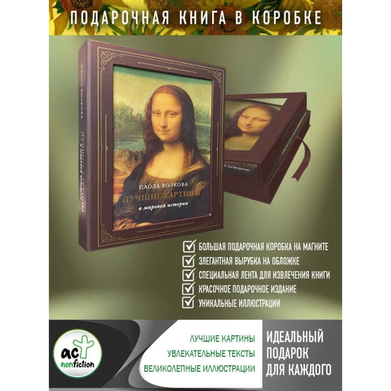 О картине можно рассказать, когда сама эта картина рассказ. Только в этом случае мы можем найти подходящие слова для ее описания. А как говорить о картине, которая сама и есть эта информация, но в ней нет рассказа, который мог бы дать нам зацепку? Ты понимаешь все, что здесь изображено, но как это передать словами? Перед вами уникальное подарочное издание "Лучшие картины в мировой истории" знаменитого советского и российского искусствоведа, историка культуры и преподавателя Паолы Волковой. Оно оформлено в виде красочно иллюстрированного альбома в шикарном футляре, содержащего множество увлекательных фактов о великих живописцах, детальные фрагменты их картин и глубочайшие размышления автора об искусстве и творчестве в целом. Благодаря книге "Лучшие картины в мировой истории" вы сможете ближе познакомиться с жизнью и работами ярчайших представителей изобразительного искусства эпох Средневековья, Возрождения, Просвещения и XIX века. Блестящий искусствовед и лектор проведет вас по лабиринту загадок и символ