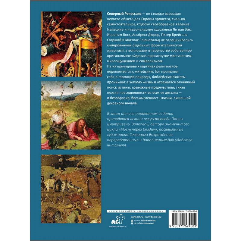 От Босха до Брейгеля: любимые картины (футляр). Северный Ренессанс - не столько вариация некоего общего для Европы процесса, сколько самостоятельное, глубоко своеобразное явление. Немецкие и нидерландские художники Ян ван Эйк, Иероним Босх, Альбрехт Дюрер, Питер Брейгель Старший и Маттиас Грюневальд не ограничивались копированием отдельных форм итальянской живописи, а воплощали в творчестве собственное оригинальное ви дение, проникнутое мистическим мироощущением и символизмом. На их причудливых картинах религиозное переплетается с житейским, Бог проявляет себя в гармонии природы, библейские сюжеты проникают в земную жизнь и отражается отчаянный поиск истины, тревожные предчувствия, тихая поэзия повседневности во всех ее деталях - и безобразие, бессмысленность жизни, лишенной духовного начала. В этом иллюстрированном издании приводятся лекции искусствоведа Паолы Дмитриевны Волковой, автора знаменитого цикла "Мост через бездну", посвященные художникам Северного Возрождения, переработанные и дополненные для удобства читателя. Книга для тех, кто ценит искусств