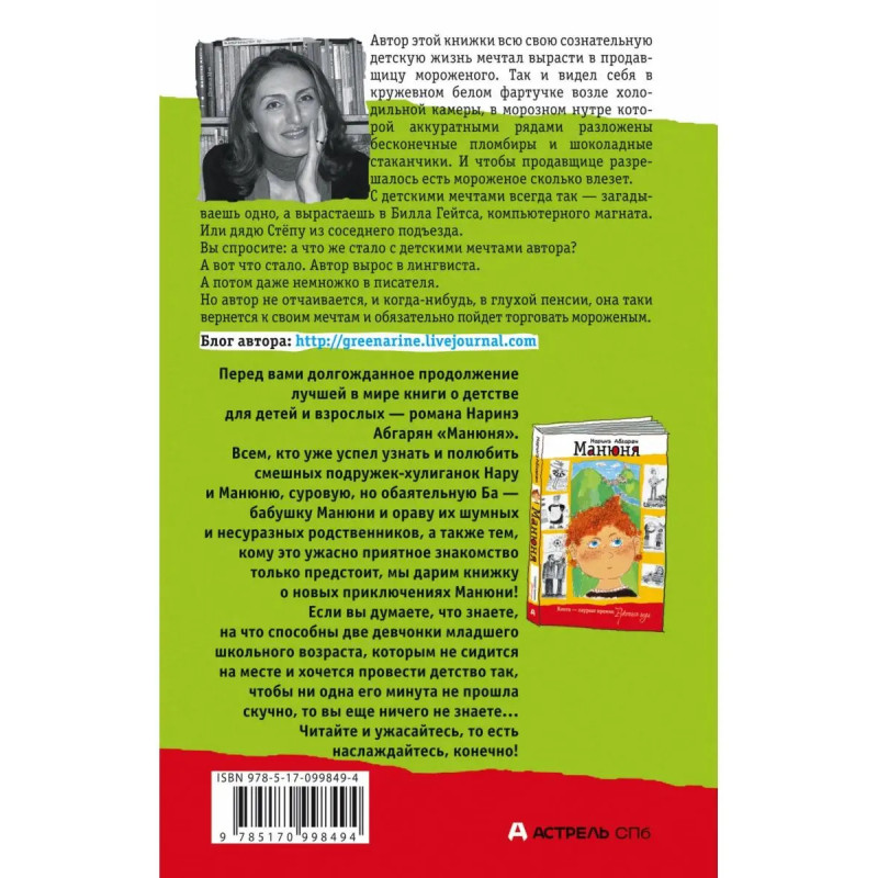Перед вами долгожданное продолжение лучшей в мире книги о детстве романа Наринэ Абгарян "Манюня". Всем, кто уже успел узнать и полюбить смешных подружек-хулиганок Нару и Манюню, суровую, но обаятельную Ба бабушку Манюни и ораву их шумных и несуразных родственников, а также тем, кому это ужасно приятное знакомство только предстоит, мы дарим книжку о новых приключениях Манюни! Если вы думаете, что знаете, на что способны две девчонки младшего школьного возраста, которым не сидится на месте и хочется провести детство так, чтобы ни одна его минута не прошла скучно, то вы еще ничего не знаете... Читайте и ужасайтесь, то есть наслаждайтесь, конечно!
