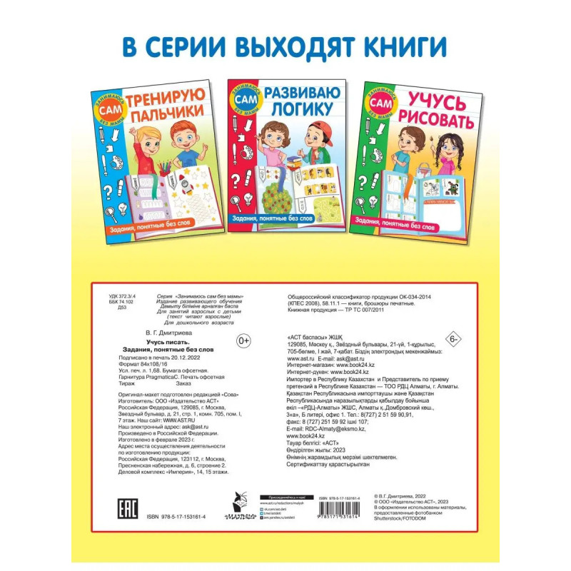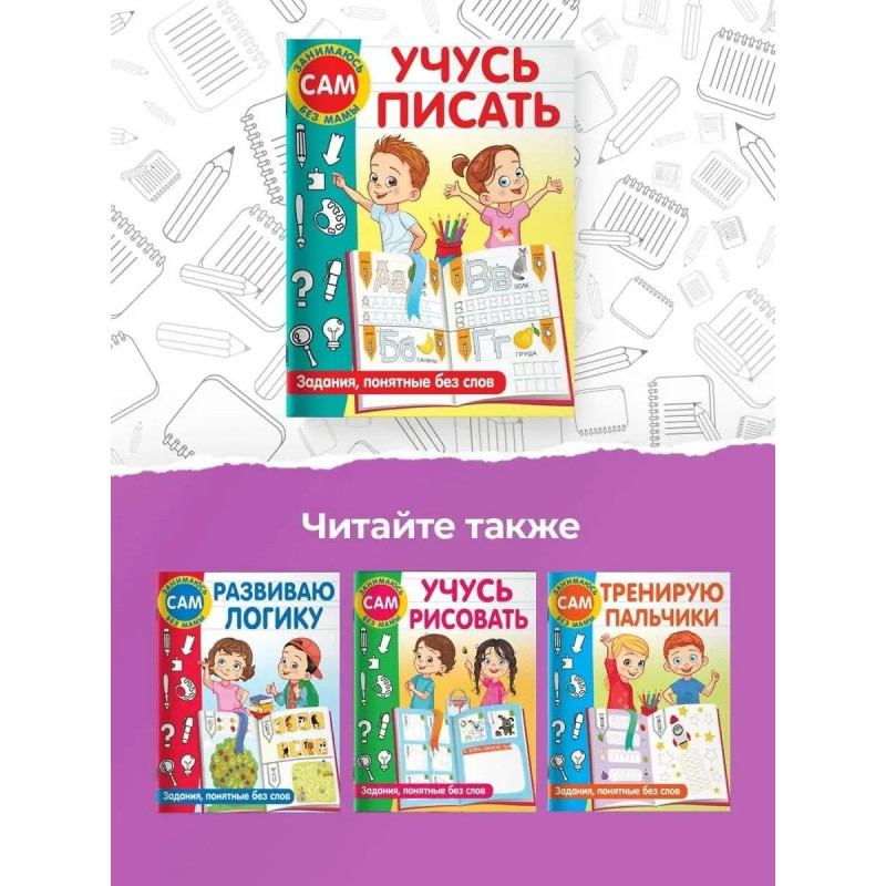 Занимаюсь сам без мамы серя книг для развития детской инициативы и самостоятельности. Интересные задания в картинках развивают гибкость ума, речь, внимание, память и графические навыки. Замечательная книга наполнит жизнь малыша новыми интересными впечатлениями и полезными знаниями, поможет сформировать у ребёнка способность к активным и самостоятельным действиям. Весёлые уроки для подготовки руки к письму. Занятия научат ребенка самостоятельности, усидчивости и аккуратности. Дошкольник запоминает буквы алфавита и тренируется их писать. Учится играя! Увлекательные занятия детям игра + креатив + обучение!
