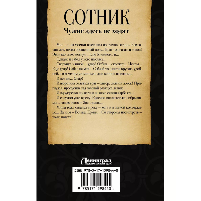Сотник. Чужие здесь не ходят. 113 год, Турово-Пинское княжество. Через его друга, туровского "сыскного" человека, местного князя Ставрогина, Михайле-сотнику передают анонимное послание, из которого становится известно о том, что в Ратное на предстоящую ярмарку прибудет человек с недобрыми целями... В окрестностях Ратного происходит целая серия загадочных и жестоких убийств, в которых можно подозревать многих: лесных разбойников-татей, скоморохов-язычников, соседей из земель боярина Журавля Михаил чувствует - главный враг где-то совсем рядом, он мстителен, коварен и неуловим. Вычислить и схватить незваного гостя - вот нынче цель сотника, ведь под удар поставлена не только его репутация, но и жизни близких людей.