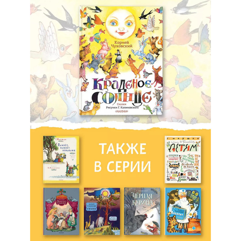 Краденое солнце. Сказки. Рисунки Г. Калиновского. Ай-яй-яй, ребята! У зверят из сказки К. Чуковского пропало солнышко: " Нам без солнышка обидно, В поле зёрнышка не видно!" - жалуется серый Воробей, плачет бедная Медведица, потерявшая своих медвежат, плачут зайки, которые теперь не могут найти дорогу домой, - все звери в отчаянии. Это злой и жадный Крокодил проглотил солнышко. И кто же поможет бедным зверятам? Читай в этой книге страшно интересные и очень увлекательные сказки классика детской литературы К. Чуковского в рисунках мастера книжной иллюстрации Г. Калиновского.