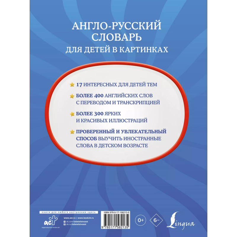 Англо-русский словарь для детей в картинках. Книга представляет собой детский тематический словарь, в котором более 400 английских слов, разделенных на 17 интересных для детей тем и сопровождающихся яркими и красивыми иллюстрациями, а также переводом и двумя видами транскрипции - фонетической и русскими буквами. Словарь в картинках - проверенный и увлекательный способ выучить первые иностранные слова в детстве. Издание предназначается для детей старшего дошкольного возраста, а также для родителей и учителей.
