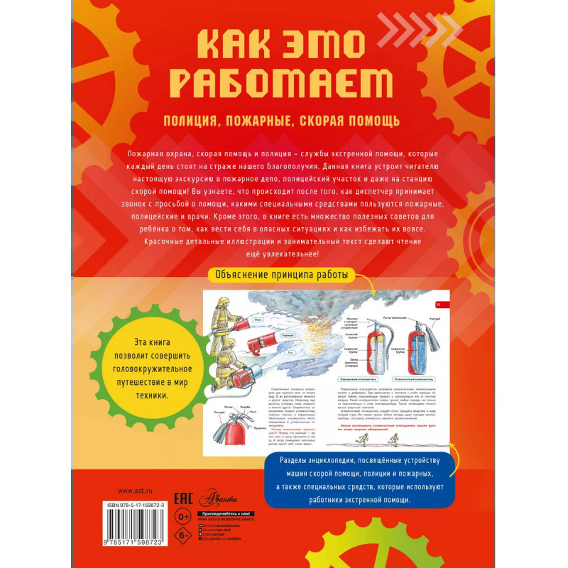 Как это работает. 112. Полиция, пожарные, скорая помощь. Пожарная охрана, скорая помощь и полиция - службы экстренной помощи, которые каждый день стоят на страже нашего благополучия. Данная книга устроит читателю настоящую экскурсию в пожарное депо, полицейский участок и даже на станцию скорой помощи! Вы узнаете, что происходит после того, как диспетчер принимает звонок с просьбой о помощи, какими специальными средствами пользуются пожарные, полицейские и врачи. Кроме этого, в книге есть множество полезных советов для ребёнка о том, как вести себя в опасных ситуациях и как избежать их вовсе. Красочные детальные иллюстрации и занимательный текст сделают чтение ещё увлекательнее!