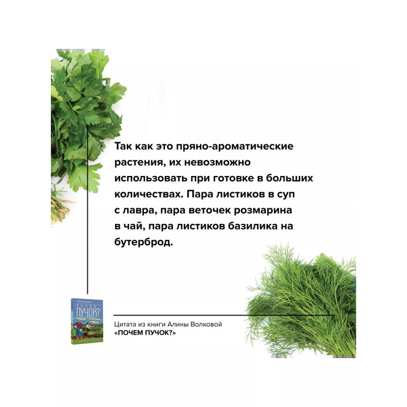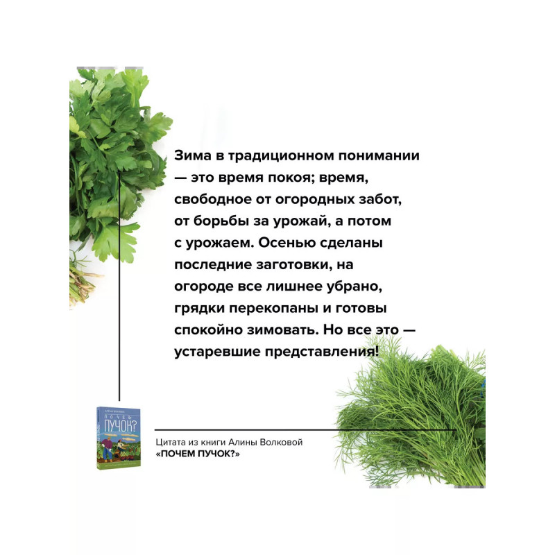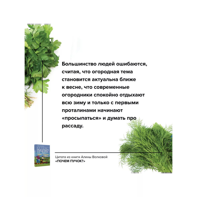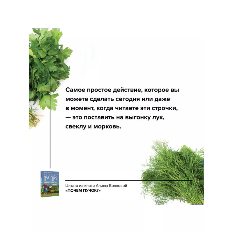 Почем пучок. Как выращивать свою зелень. Думаете, свежую зелень можно есть только летом с шашлыком на даче? Алена Волкова, автор книги "Почем пучок. Как выращивать свою зелень" докажет вам, что это устаревший стереотип и наслаждаться поливитаминами из зелени можно и нужно круглый год. В книге вы найдете советы по выращиванию и заготовке зелени от кандидата биологических наук, садовода с 10-летним стажем, автора канала на ютуб "Аленин сад" Алены Волковой. Рекомендации Алены помогут вам выращивать как распространенные виды микрозелени, такие как горох, редис, базилик или брокколи, так и редкие виды, например, настурцию, мизуну, лебеду или овес. Овладеть искусством выращивания домашней зелени сможет каждый! На страницах книги вы найдете простые способы для новичков, например, выращивание зелени из остатков, и более замысловатые способы, для профессионалов или тех, кто хочет превратить свое зеленое увлечение в бизнес.