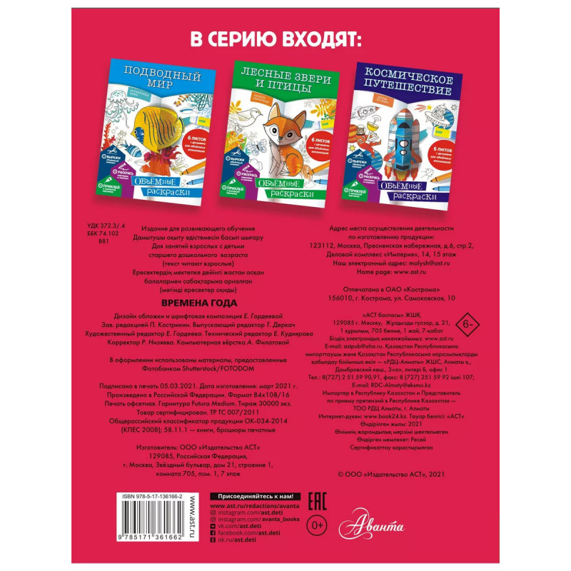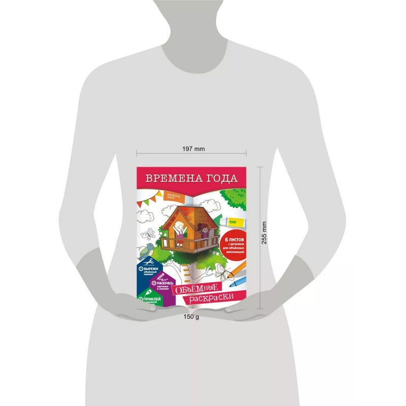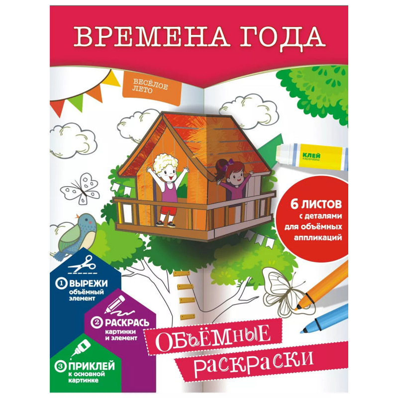 Времена года. Новая серия "Объемные раскраскиФП" Эти книги можно не только раскрашивать, но и создавать на их страницах настоящие объемные аппликации. Для этого надо вырезать детали с центральных страниц книги и наклеить их на развороты в нужных местах.