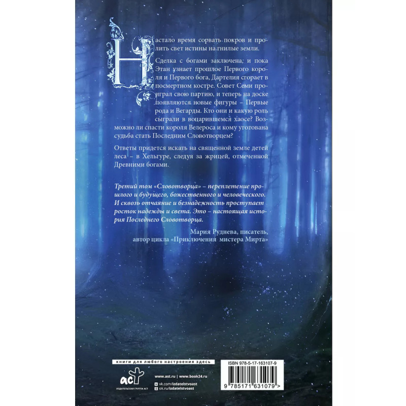 Третий том цикла Последний Словотворец! Пришло время приоткрыть покров и пролить свет истины на гнилые земли. Договоренность с богами заключена, и Дартелия сгорает в посмертном пламени. Этан же видит прошлое и узнает тайны Первого короля и Первого бога. Совет Семи потерпел крах, и на доску выходят новые фигуры Первые рода и Вегарды. В чем их сила, в чем роль в игре? Есть ли шанс спасти короля Велероса и кому уготована судьба стать Последним Словотворцем? Ответы ищи у детей леса в Хельгуре, следуя за жрицей путем Древних богов.
