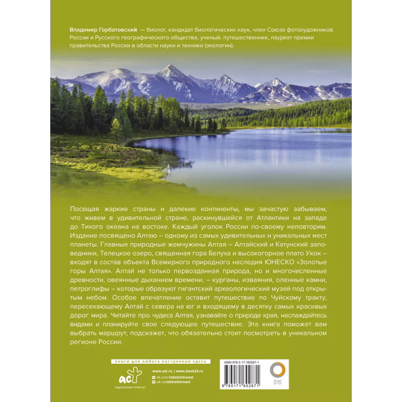 Издание посвящено Алтаю одному из самых удивительных и уникальных мест не только в России, но и в мире. Достаточно отметить, что главные природные изюминки Алтая Алтайский и Катунский заповедники, Телецкое озеро, священная гора Белуха и высокогорное плато Укок входят в состав объекта Всемирного природного наследия ЮНЕСКО Золотые горы Алтая. В книге впервые представлено подробное описание с многочисленными красочными авторскими фотографиями наиболее живописных заповедных мест Алтая. Именно на этих территориях сконцентрированы самые значимые природные достопримечательности Алтая, к ним проложены экологические маршруты, оборудованные стоянками и местами для отдыха. Но Алтай не только первозданная природа, но и многочисленные древности, овеянные дыханием времени курганы, изваяния, оленные камни, петроглифы, которые образуют гигантский археологический музей под открытым небом.