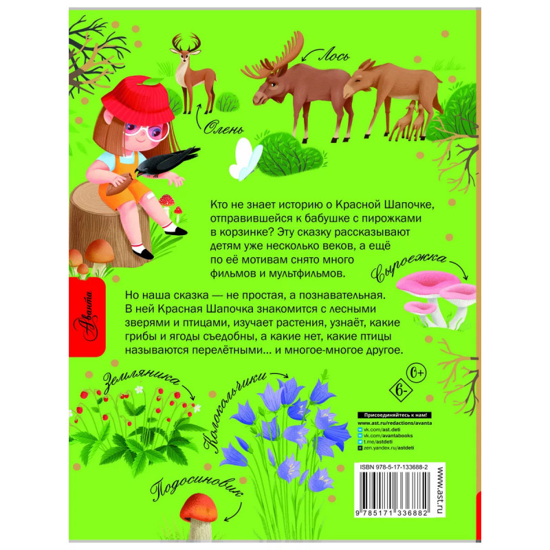 Красная Шапочка и тайны леса. Кто не знает историю о Красной Шапочке, отправившейся к бабушке с пирожками в корзинке? Эту сказку рассказывают детям уже несколько веков, по её мотивам снято много фильмов и мультфильмов. Но наша сказка - не простая, а познавательная. В ней Красная Шапочка знакомится с лесными зверями и птицами, изучает растения, узнаёт, какие грибы и ягоды съедобны, а какие нет, какие птицы называются перелётными... и многое-многое другое. Книгу украшают чудесные иллюстрации Светланы Зориной. Для младшего школьного возраста.