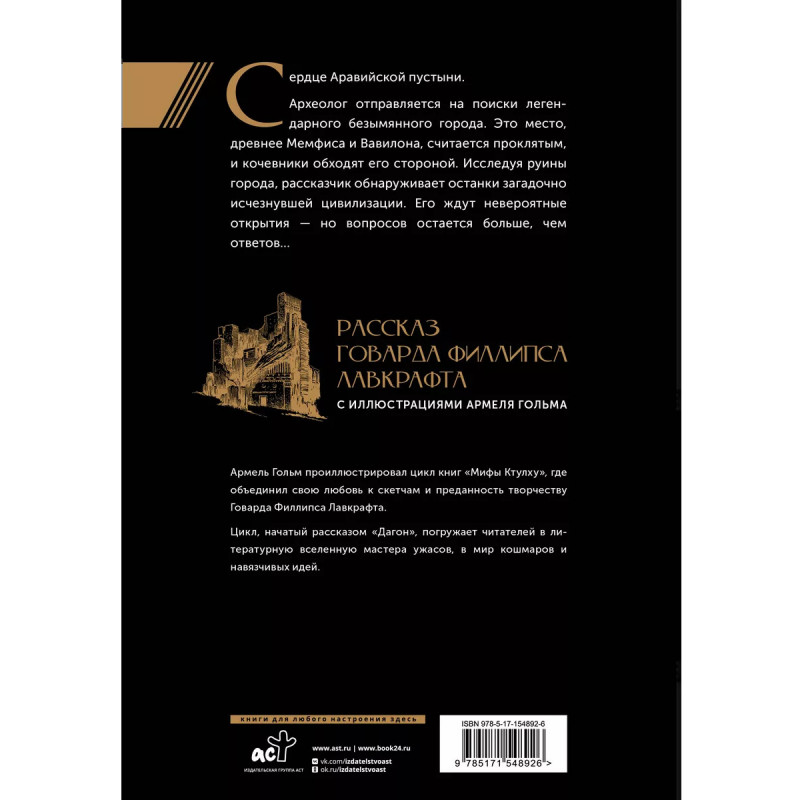 Безымянный город с иллюстрациями Армеля Гольма. Полный мрачных древних загадок рассказ Говарда Лавкрафта с иллюстрациями французского графического дизайнера Армеля Гольма. Гольм - преданный фанат классика американского ужаса и энтузиаст, проиллюстрировавший множество рассказов цикла "Мифы Ктулху". Издание в улучшенном оформлении: суперобложка с золотым тиснением и лента-ляссе. В самом сердце Аравийской пустыни лежат развалины древнего города. Жители окрестных поселений считают его проклятым, а караваны обходят стороной. Ведомый непреодолимым наваждением, исследователь находит руины и спускается в их недра. Увиденное там едва не лишает его рассудка