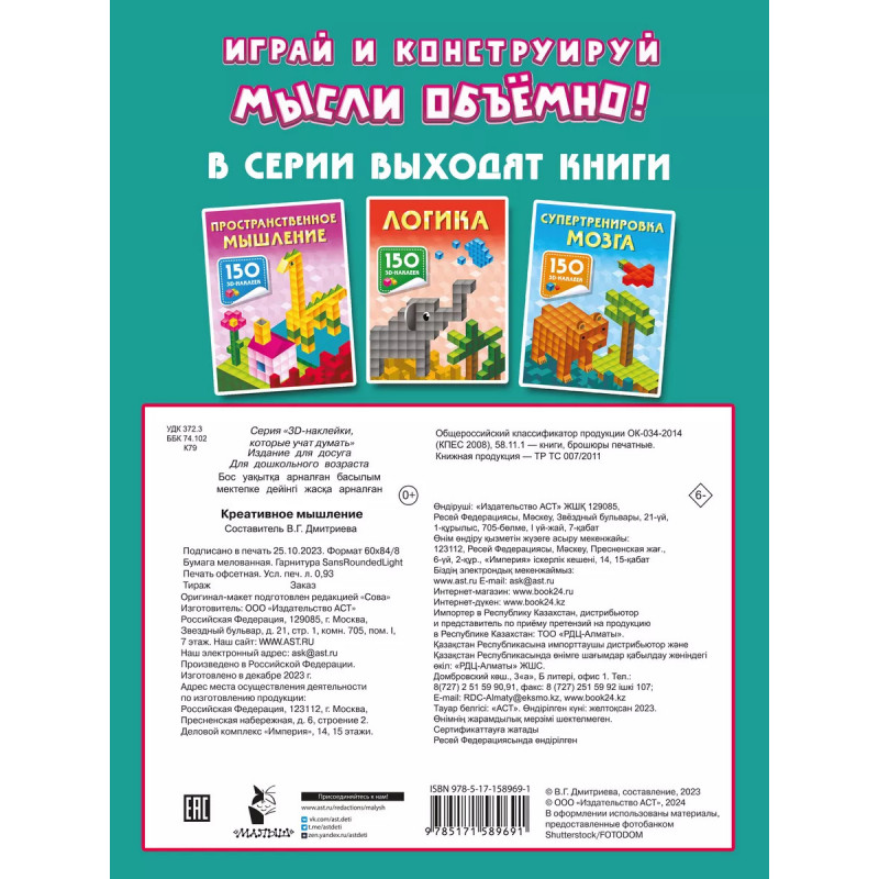 Креативное мышление. "Креативное мышление" - это развивающая книжка с 3D-наклейками для детей от 5 лет. 3D-стикеры - специальные "кирпичики", из которых нужно строить различные трёхмерные объекты. Заниматься по книжке не только интересно, но и очень полезно, ведь моделирование объёмных предметов стимулирует пространственное мышление, а игра с наклейками способствует развитию мелкой моторики.