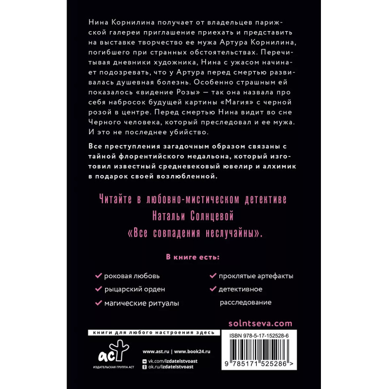Нина Корнилина получает от владельцев парижской галереи приглашение приехать и представить на выставке творчество ее мужа Артура Корнилина, погибшего при странных обстоятельствах. Перечитывая дневники художника, Нина с ужасом начинает подозревать, что у Артура перед смертью развивалась душевная болезнь. Особенно страшным ей показалось "видение Розы", так она назвала про себя набросок будущей картины "Магия" с черной розой в центре. Перед смертью Нина видит во сне Черного человека, который преследовал и ее мужа. И это не последнее убийство. Все преступления загадочным образом связаны с тайной флорентийского медальона, который изготовил известный средневековый ювелир и алхимик в подарок своей возлюбленной.