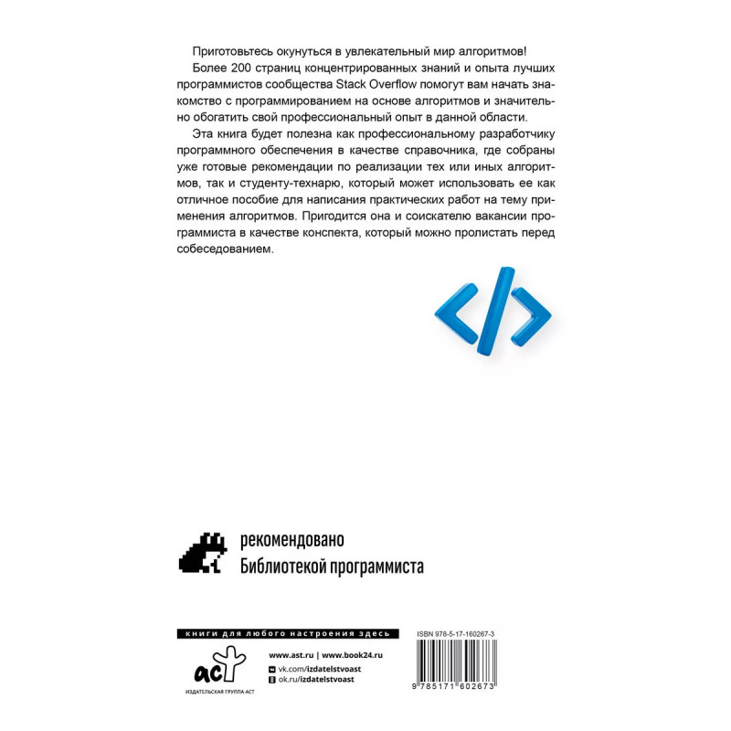 Алгоритмы в задачах и примерах. Самые эффективные способы и решения от сообщества Stack Overflow. Эта книга - не академический учебник по программированию, а скорее сборник универсальных "рецептов" использования широкого класса алгоритмов в самых распространенных случаях, требующих применения четкой последовательности инструкций для создания изящного и максимально оптимизированного рабочего кода. Если вы стремитесь понять сущность алгоритмов и в совершенстве овладеть ими для решения разнообразных задач при разработке программного обеспечения, это издание станет вашим незаменимым помощником. Каждый раздел книги базируется на топовых материалах сайта Stack Overflow на тему алгоритмов и представляет собой краткое описание алгоритма с примерами, реализованными на разных языках программирования или в псевдокоде. В числе прочих рассмотрены алгоритмы работы с графами, алгоритмы быстрого поиска и сортировки, алгоритмы обработки строковых переменных и многое другое.
