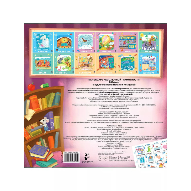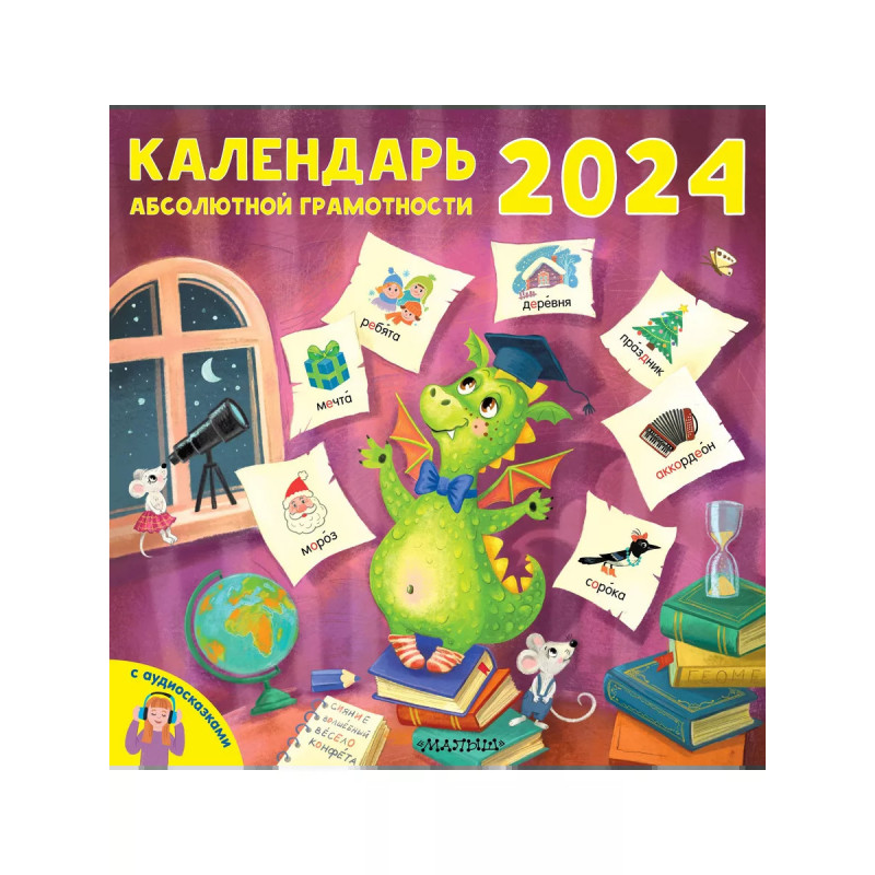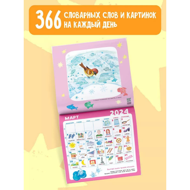 Календарь абсолютной грамотности настенный 2024. Стать грамотным легко! Красочный календарь со множеством чудесных картинок и прикольных скороговорок поможет вашему ребенку быстро и без труда запомнить целых 366 словарных слов! Занимайтесь каждый день всего несколько минут, и результат появиться уже через месяц. А познавательные аудиосказки популярного детского автора Н. Немцовой помогут расширить кругозор и подарят хорошее настроение. Занимайтесь с пользой и удовольствием целый год!