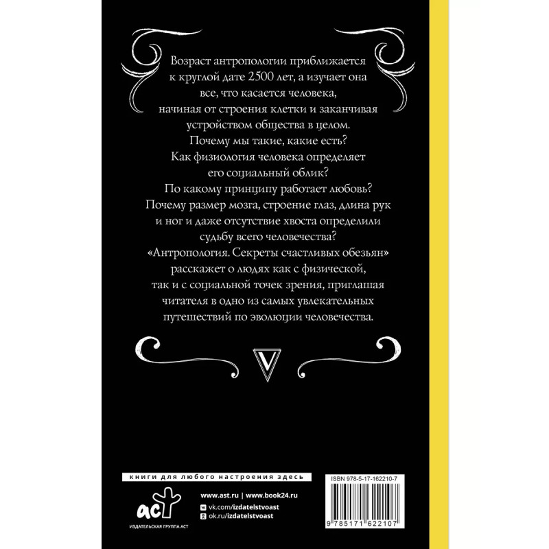 Антропология. Секреты счастливых обезьян. Возраст антропологии приближается к круглой дате 2500, а изучает она все, что касается человека, начиная от строения клетки и заканчивая устройством общества в целом. Почему мы такие, какие есть? Как физиология человека определяет его социальный облик? По какому принципу работает любовь? Почему размер мозга, строение глаз, длина рук и ног и даже отсутствие хвоста определили судьбу всего человечества? "Антропология. Секреты счастливых обезьян" расскажет о людях как с физической, так и с социальной точек зрения, приглашая читателя в одно из самых увлекательных путешествий по эволюции человечества.