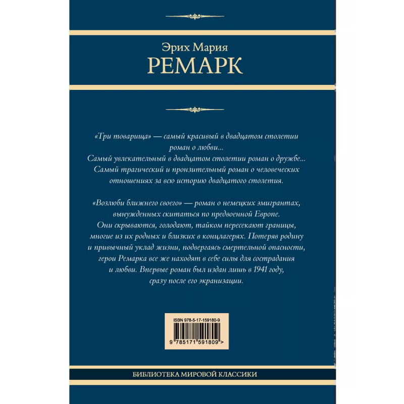 "Три товарища" - самый красивый в двадцатом столетии роман о любви... Самый увлекательный в двадцатом столетии роман о дружбе... Самый трагический и пронзительный роман о человеческих отношениях за всю историю двадцатого столетия. "Возлюби ближнего своего" - роман о немецких эмигрантах, вынужденных скитаться по предвоенной Европе. Они скрываются, голодают, тайком пересекают границы, многие из их родных и близких в концлагерях. Потеряв родину и привычный уклад жизни, подвергаясь смертельной опасности, герои Ремарка все же находят в себе силы для сострадания и любви. Впервые роман был издан лишь в 1941 году, сразу после его экранизации.