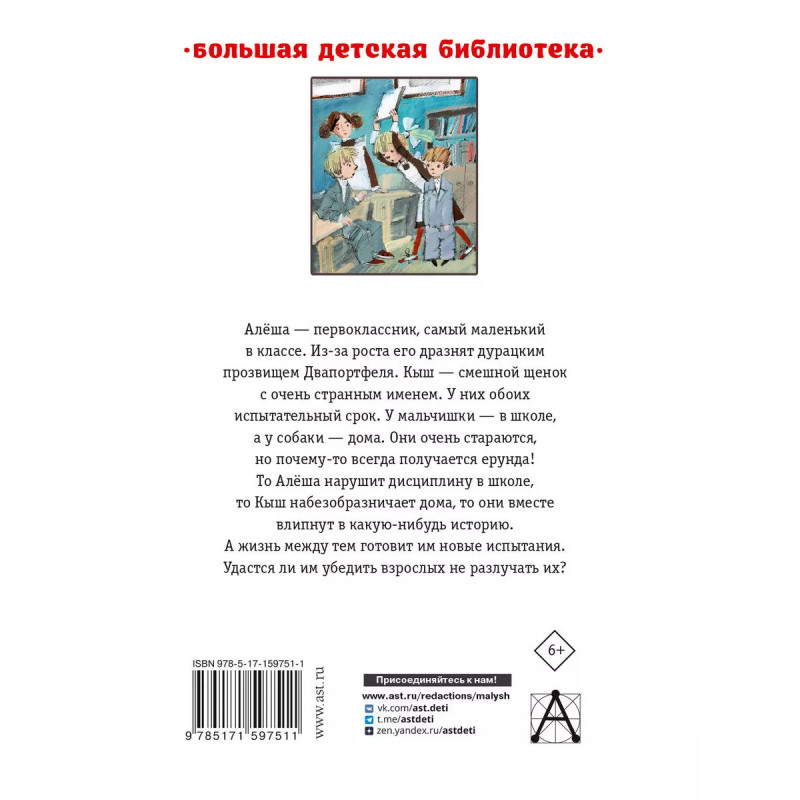 Кыш, Двапортфеля и целая неделя. Повести. Алёша - первоклассник, самый маленький в классе. Из-за роста его дразнят дурацким прозвищем Двапортфеля. Кыш - смешной щенок с очень странным именем. У них обоих испытательный срок. У мальчишки в школе, а у собаки - дома. Они очень стараются, но почему-то всегда получается ерунда! То Алёша нарушит дисциплину в школе, то Кыш набезобразничает дома, то они вместе влипнут в какую-нибудь историю. А жизнь, между тем, готовит им новые испытания. Удастся ли им убедить взрослых не разлучать их?