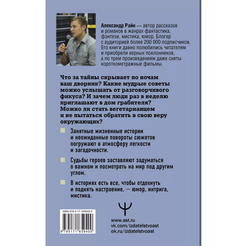 Александр Райн автор рассказов и романов в жанрах фантастика, фэнтези, мистика, юмор. Блогер с аудиторией более 200 000 подписчиков. Что за тайны скрывает по ночам ваш дворник? Какие мудрые советы можно услышать от разговорчивого фикуса? И зачем люди раз в неделю приглашают в дом грабителя? Можно ли стать вегетарианцем и не пытаться обратить в свою веру окружающих? На страницах книги вы найдете ответы на эти и другие, еще более удивительные вопросы. Погрузитесь в невероятный мир юмористической мистики и жизненных историй. Поверьте, возвращаться в реальность из интригующих фантазий не захочется.
