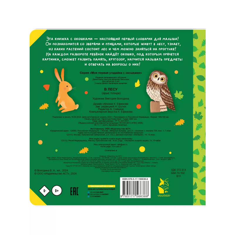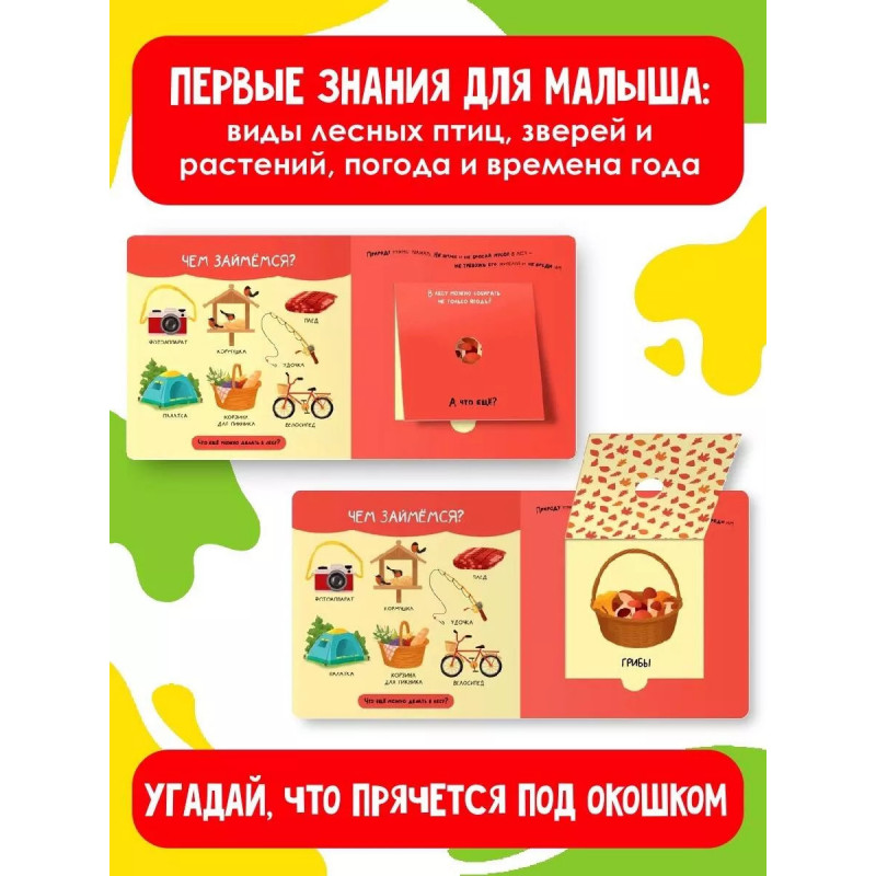 Эта книжка с окошками настоящий первый словарик для малыша! Он познакомится со зверями и птицами, которые живут в лесу, узнает, из каких растений состоит лес и чем можно заняться на прогулке! На каждом развороте ребёнок найдёт окошко, под которым прячется картинка, сможет развить память, кругозор, научится называть предметы и отвечать на вопросы о них! "Моя первая угадайка с окошками" - познавательная серия для самых маленьких читателей. Актуальные для малыша темы, плотные картонные странички, вопросы для развития речи и окошки превратят обучение в увлекательную игру!